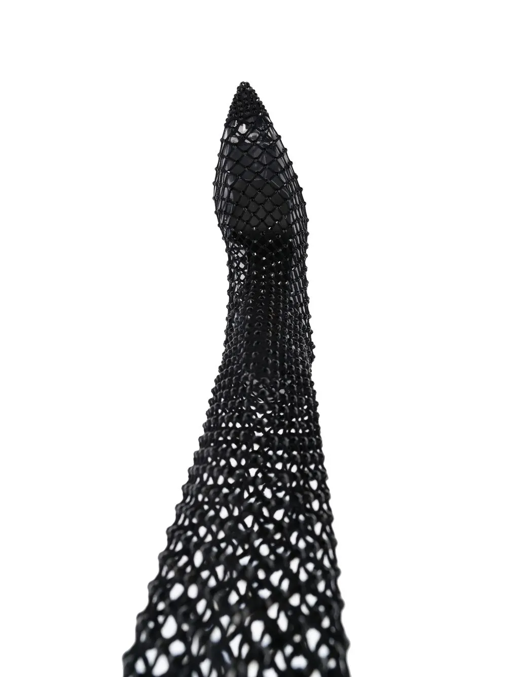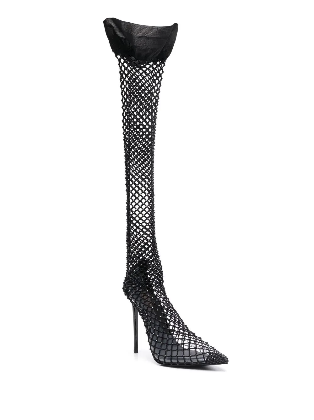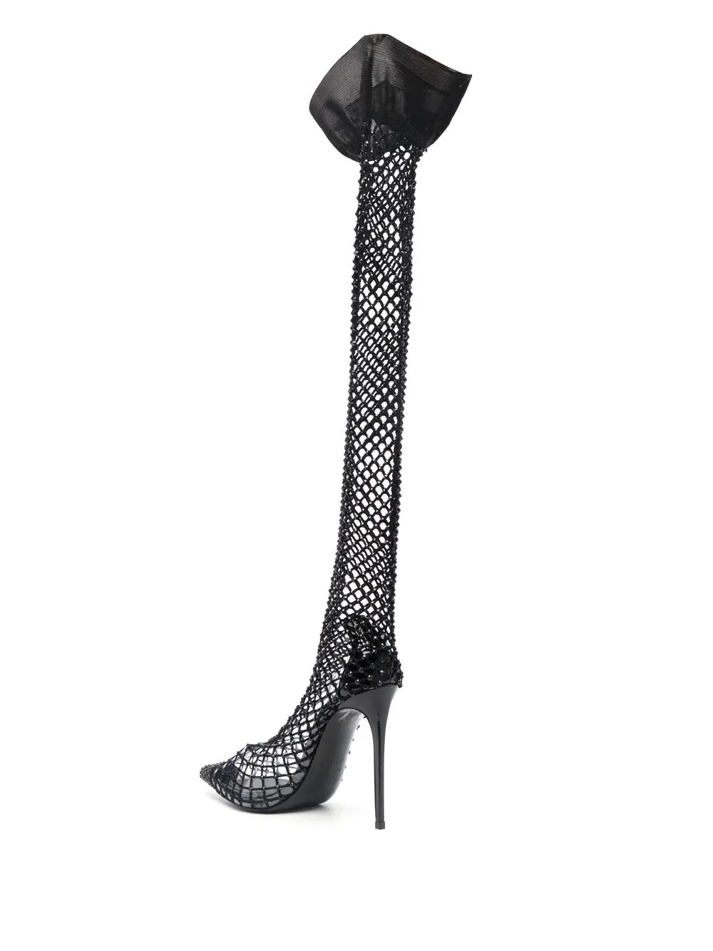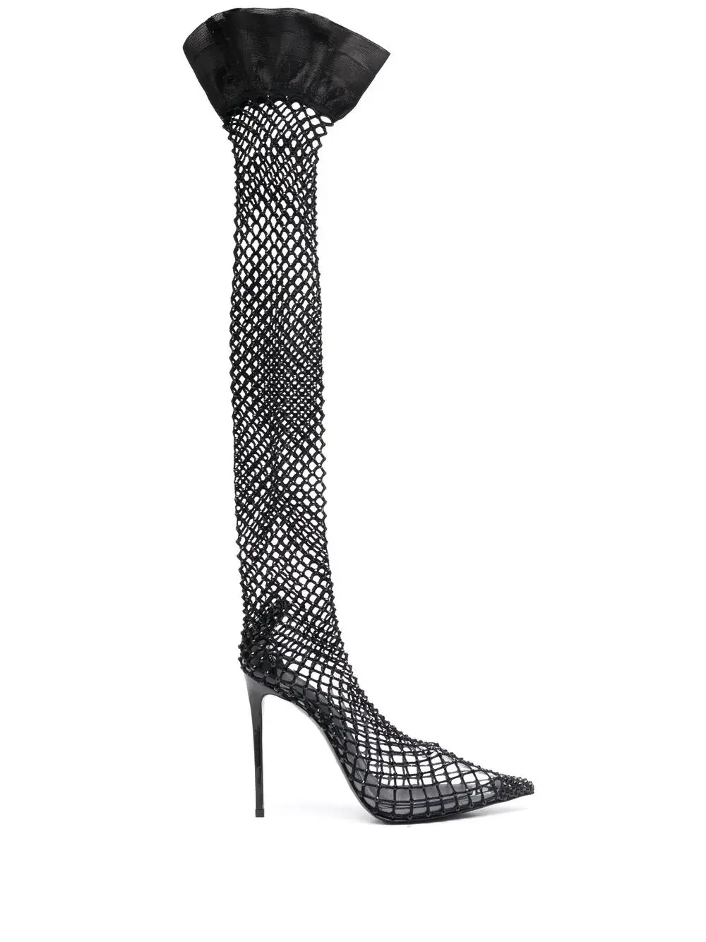 Черный, телячья кожа, ажурная вязка, манжеты с оборками, декор из кристаллов, высота до линии бедра, заостренный носок и кожаная стелька с логотипом.