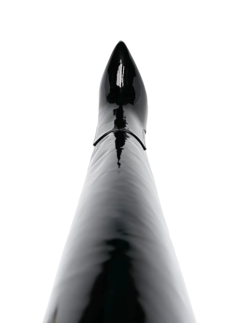 Черный, телячья кожа, лакированная отделка, заостренный носок, модель без застежки и каблук на высокой шпильке.