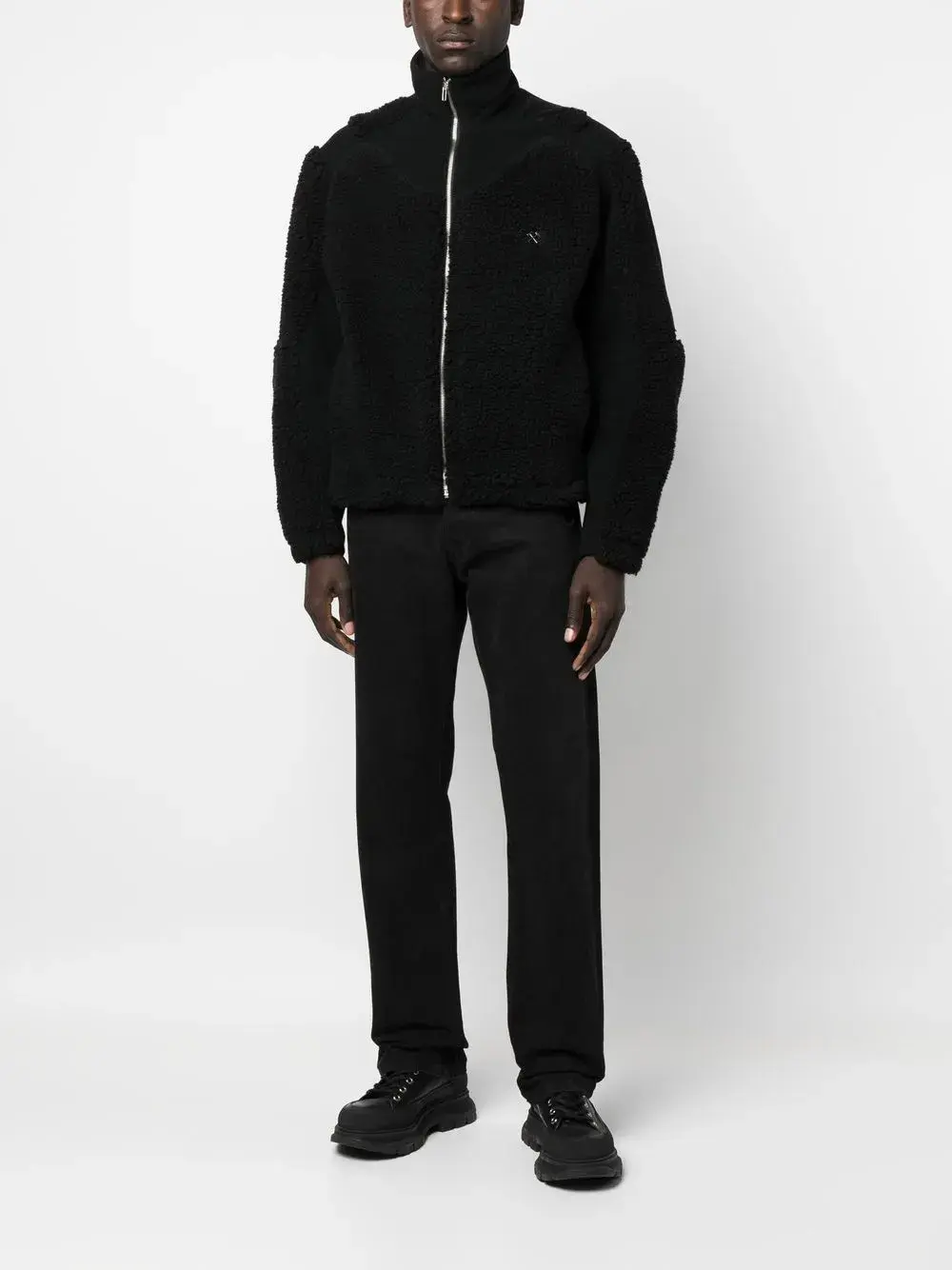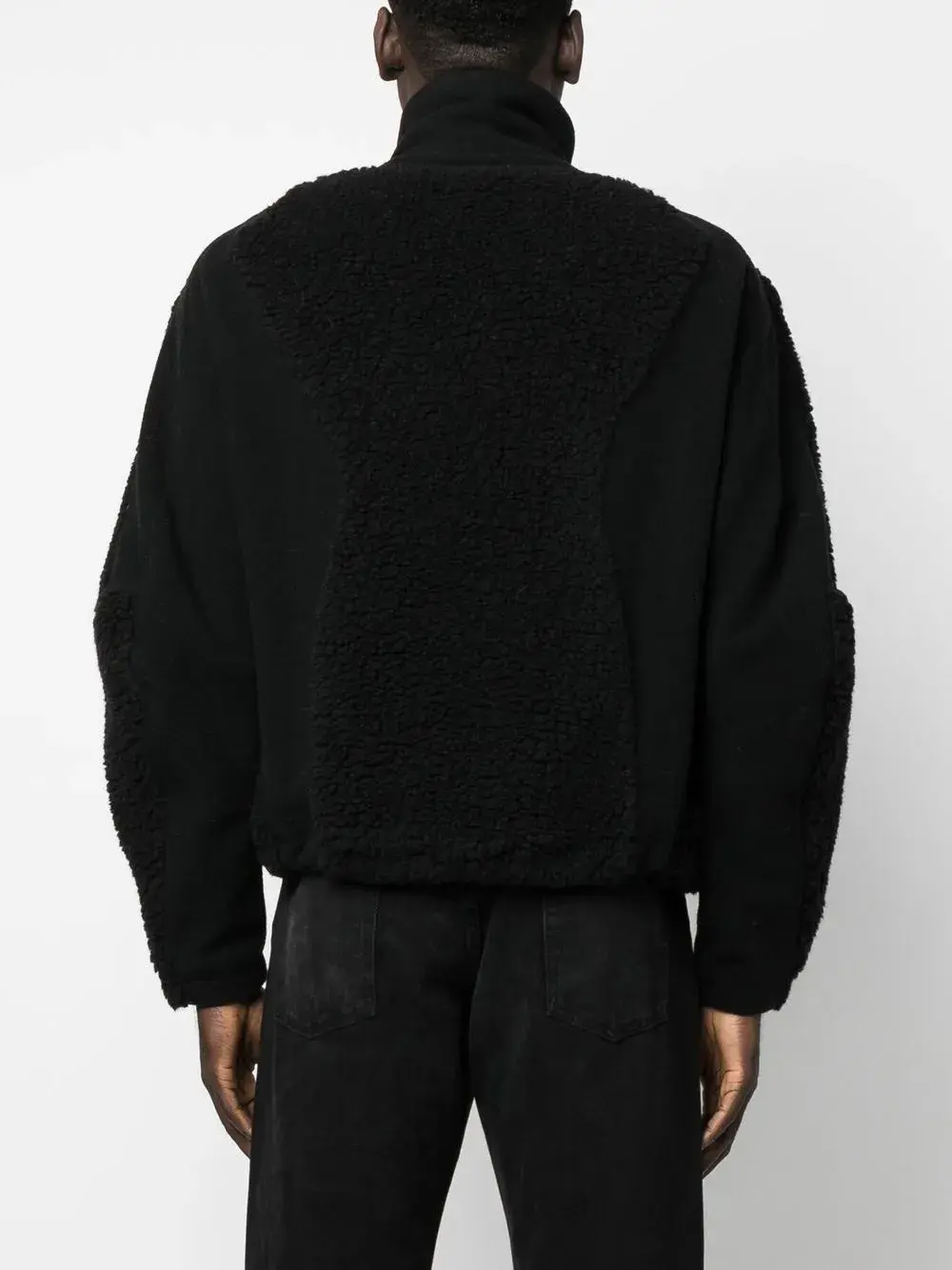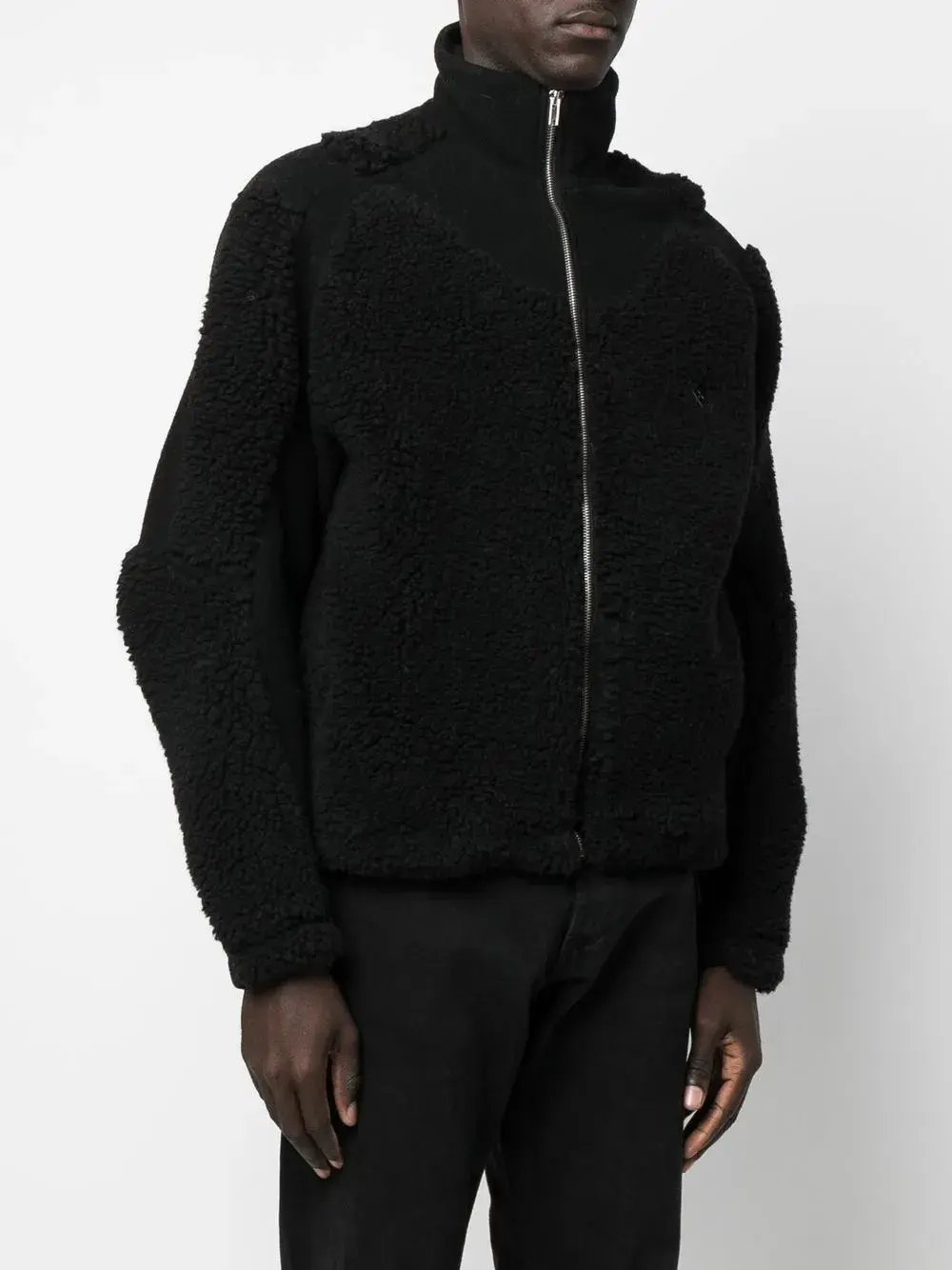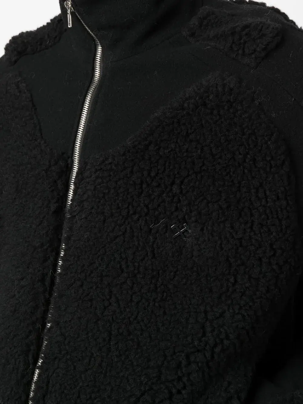 Черный, шерсть, фактурная отделка, воротник-труба, металлический логотип, застежка на молнии спереди, длинные рукава и подол с кулиской.