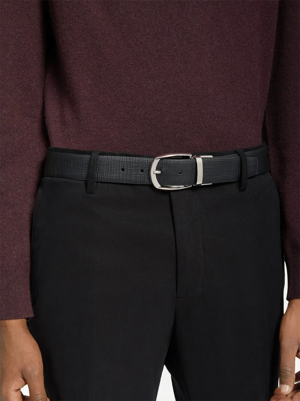 Черный, ремешок из телячьей кожи, выгравированный логотип, двусторонний дизайн, застежка на серебристой пряжке, прорезанные отверстия и несколько оборотов.