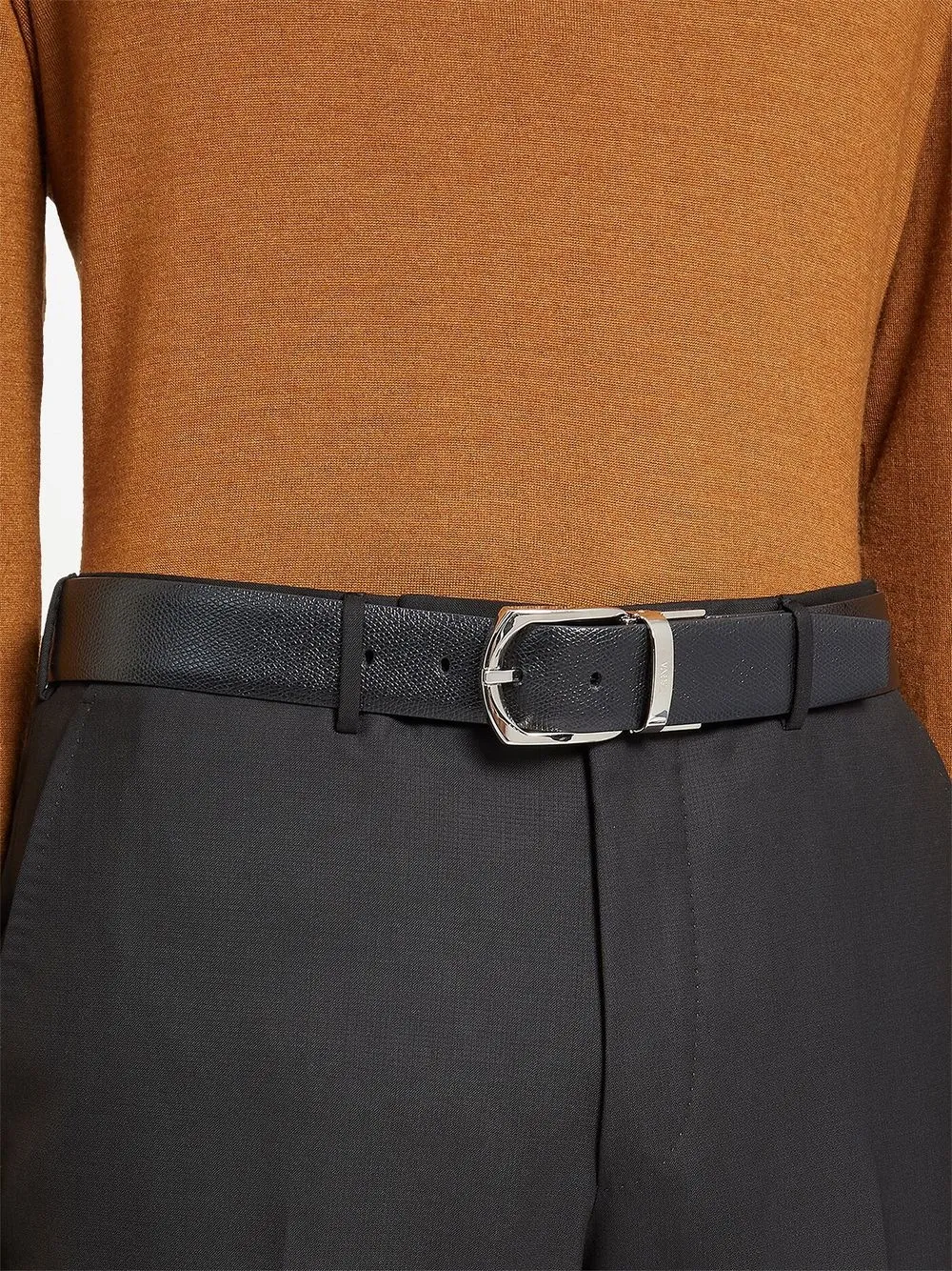 Черный, ремешок из телячьей кожи, двусторонний дизайн, зернистая текстура, выгравированный логотип, застежка на серебристой пряжке, регулируемый дизайн и несколько оборотов.
