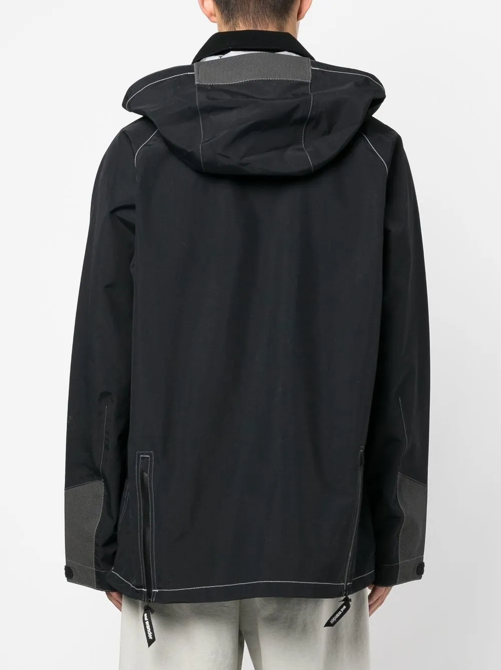 Черный, вышитый логотип спереди, логотип спереди, контрастная строчка, светоотражающие детали, детали с молниями, отложной воротник, затягивающийся на шнурок капюшон, застежка на кнопках спереди, длинные рукава реглан, два нагрудных кармана на молнии и два кармана карго спереди.
