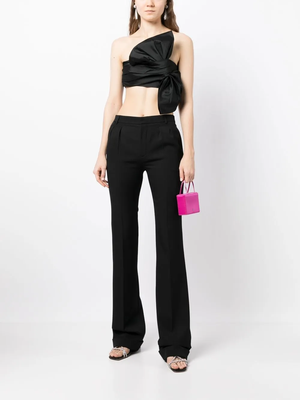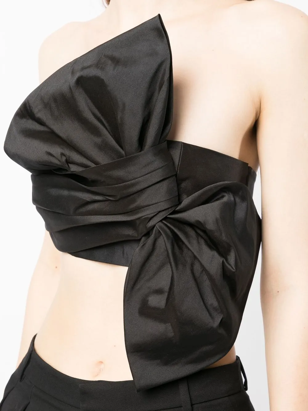 Черный, подвеска в виде банта, без бретелей, снуд, потайная застежка на молнии сзади и укороченная длина.