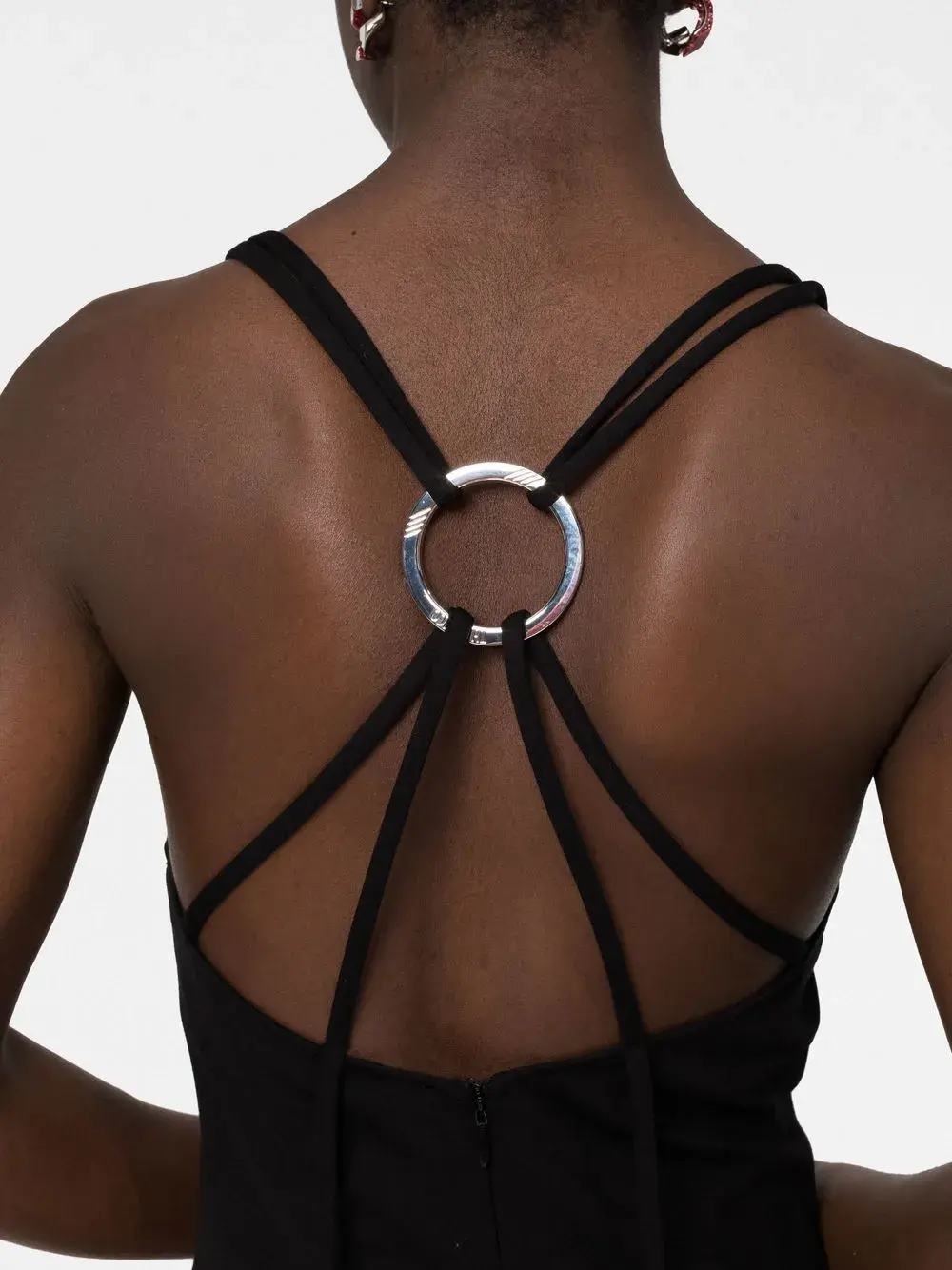 Черный, страусиные перья, серебристая фурнитура, тонкие бретели, квадратный вырез, U-образный вырез на спине, застежка на молнии сзади и прямой подол.