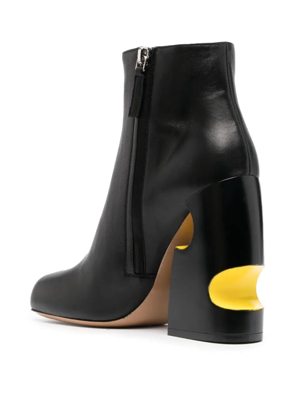 Черный, кожа наппа, вырезные детали, квадратный носок, высота по щиколотку, застежки на молнии сбоку и высокий блочный каблук.