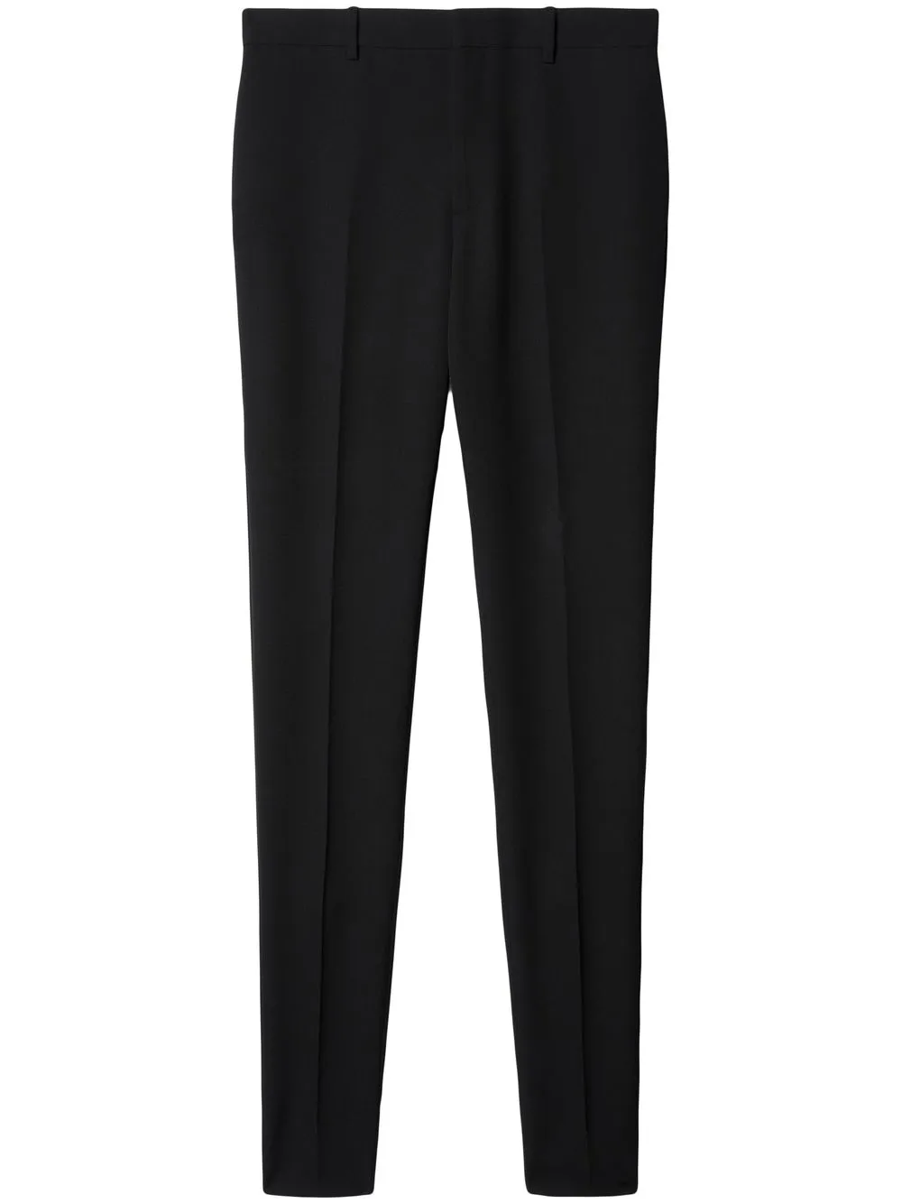 Черный, шерсть, облегающий крой, потайная застежка спереди, петли для ремня, стрелки, два кармана с листочкой сзади, нашивка с логотипом сзади и расклешенный подол.