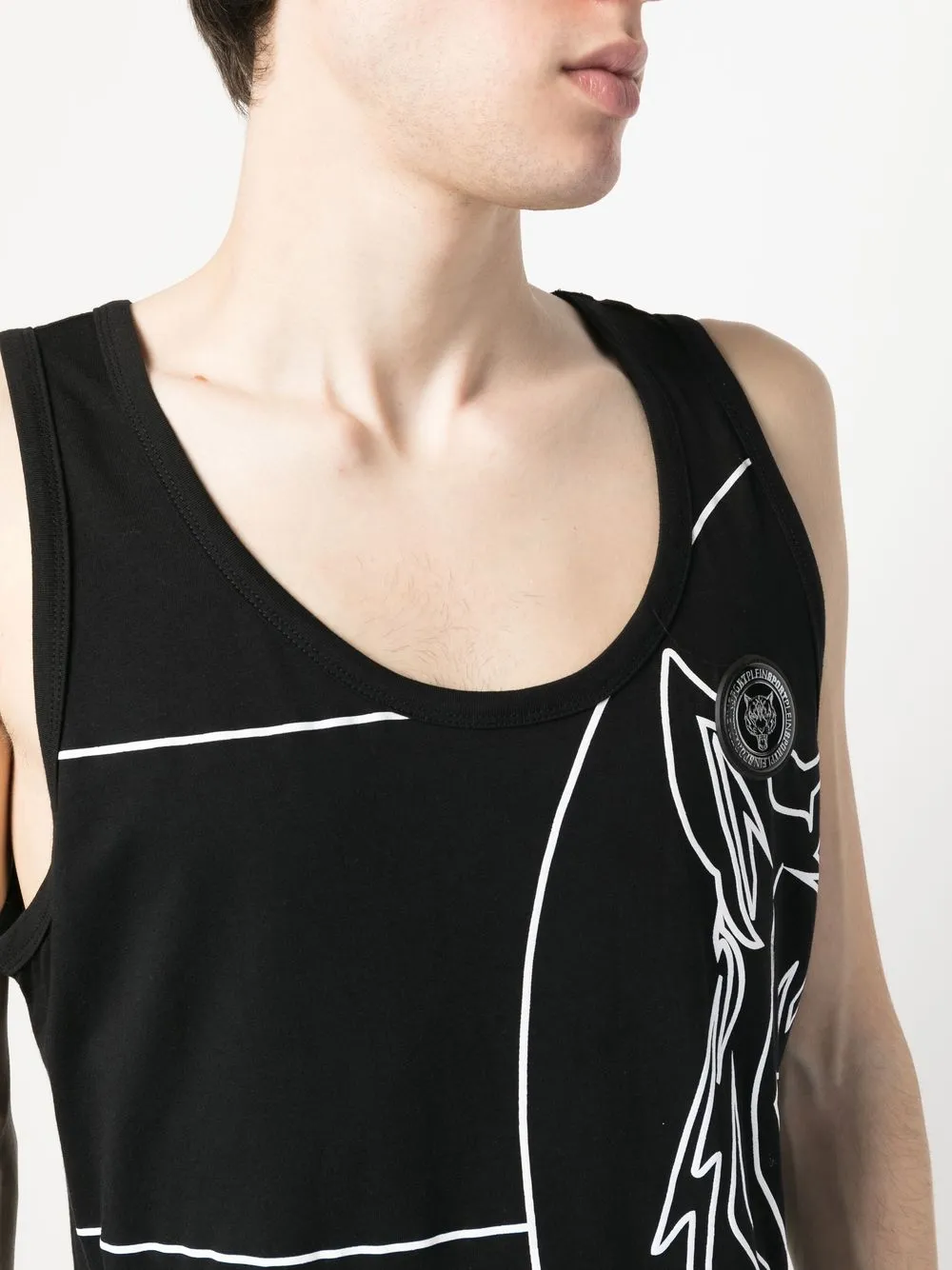 Черный/белый, принт с изображением тигра, нашивка с логотипом на груди, сплошной графичный принт, U-образный вырез, без рукавов и прямой подол.