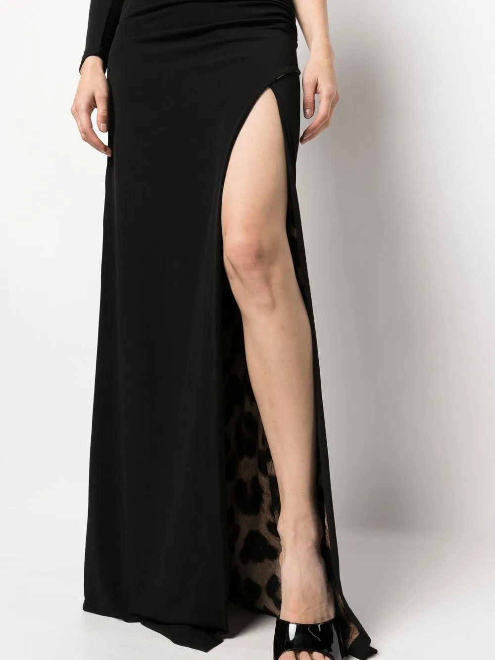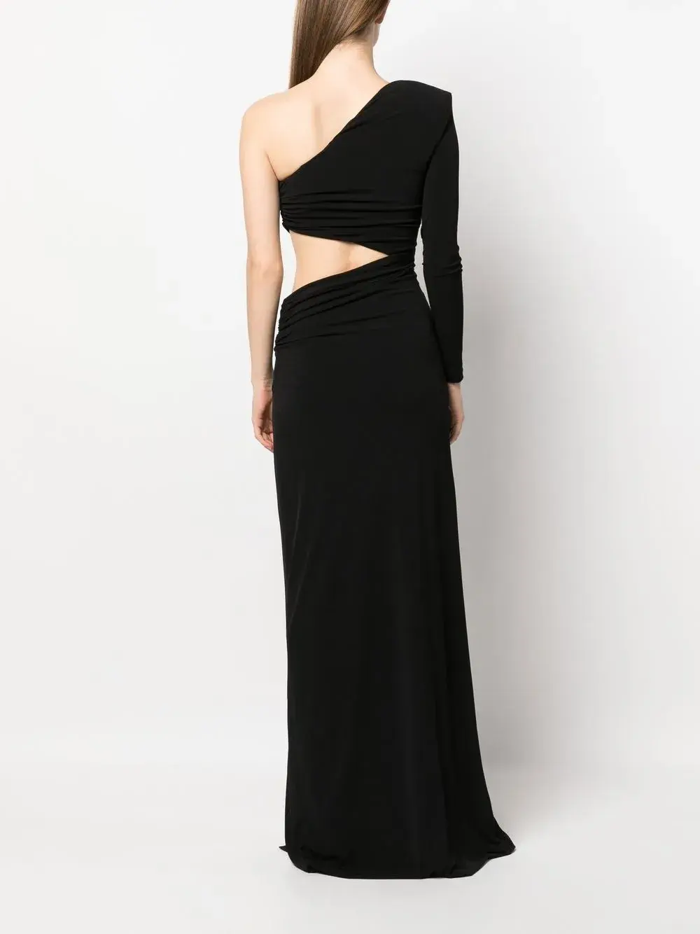 Черный, расклешенный крой, открытые плечи, вырезные детали, длинные рукава, разрез спереди и длинная модель.