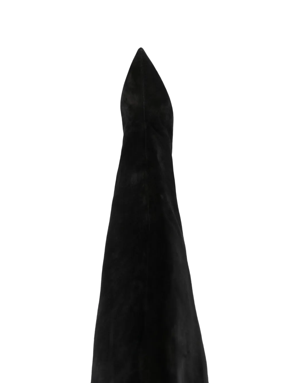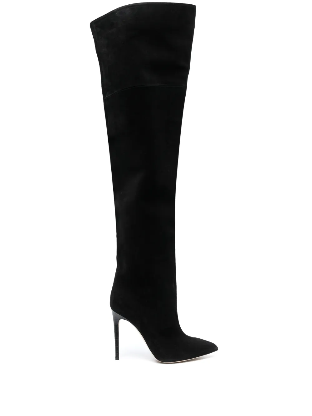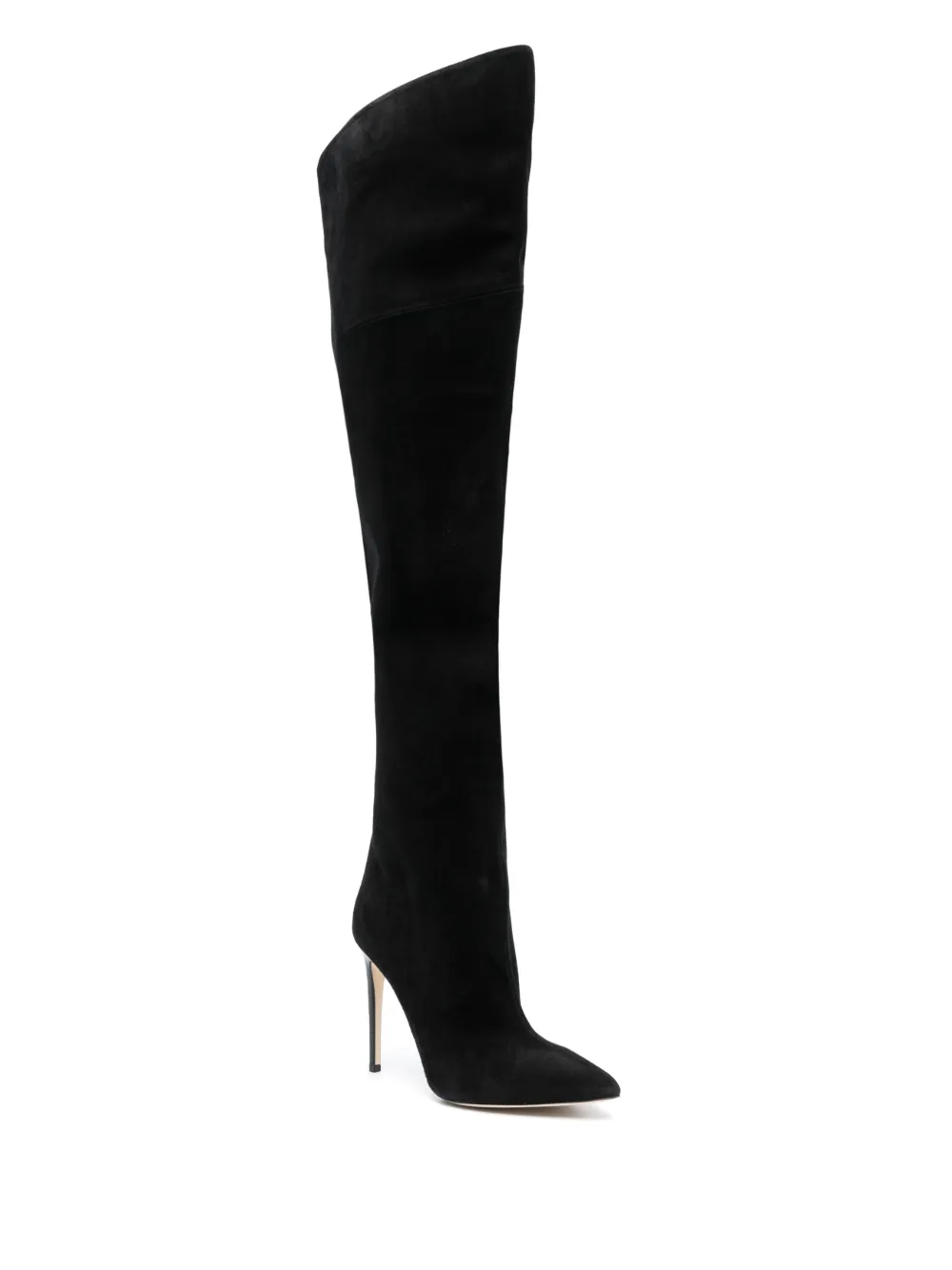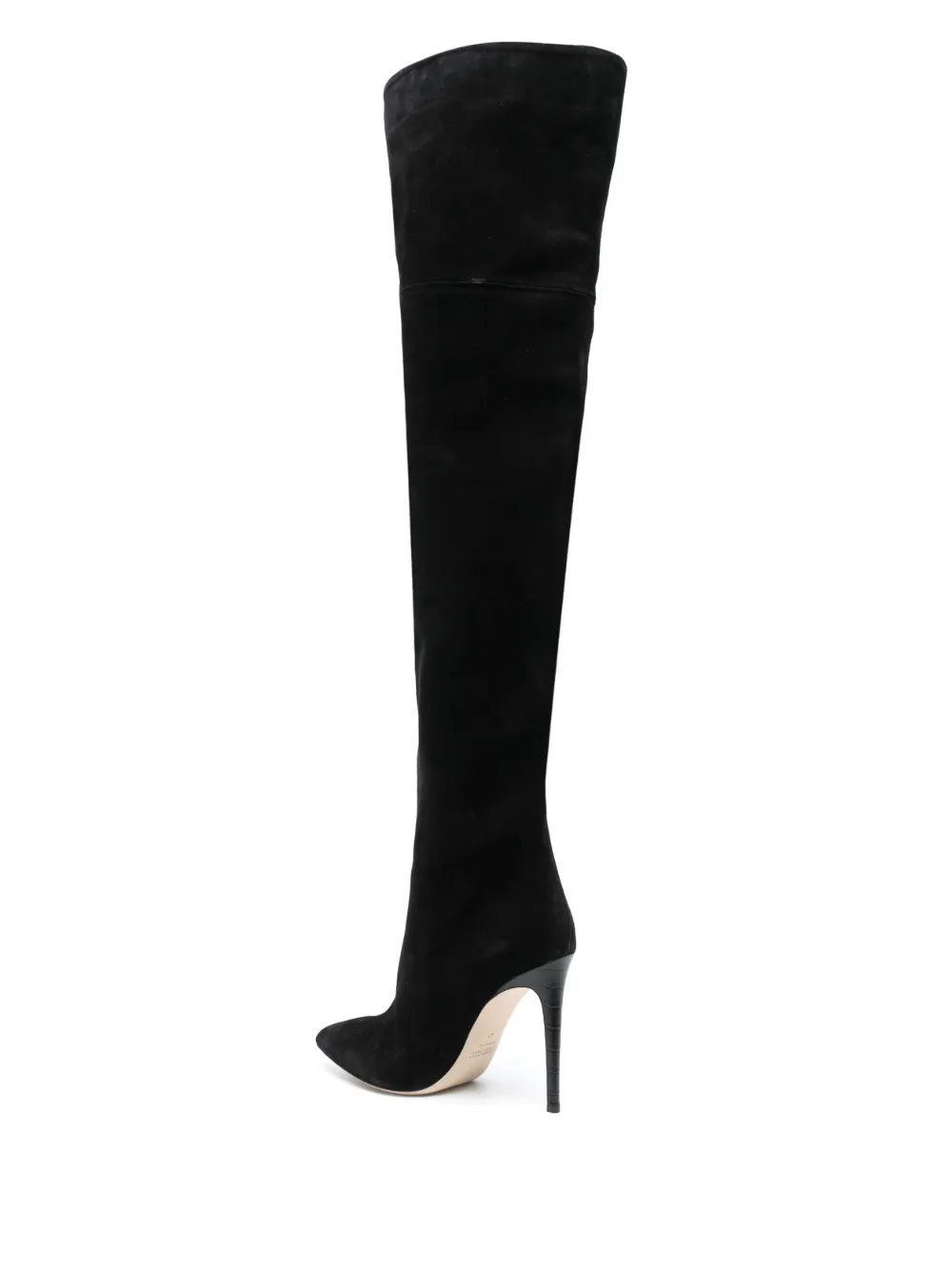 Черный, телячья кожа, заостренный носок, каблук-шпилька и длина до бедер.