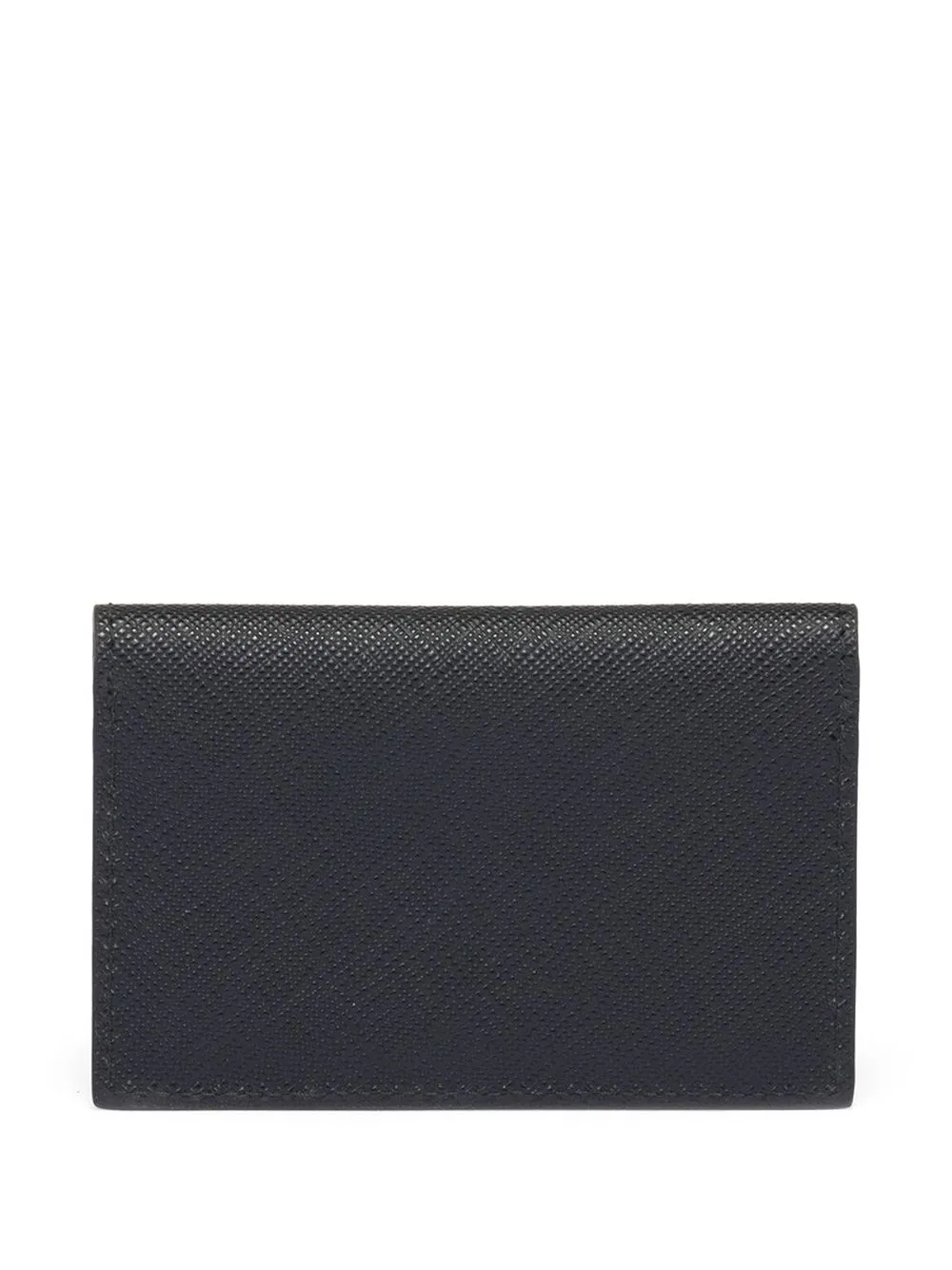 Черный, телячья кожа, треугольный эмалированный логотип, откидной верх с застежкой на кнопки, тисненый логотип внутри и внутренние отделения для карт.