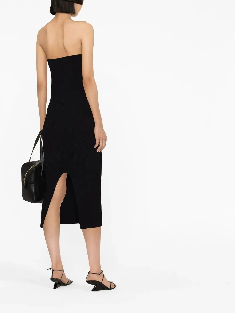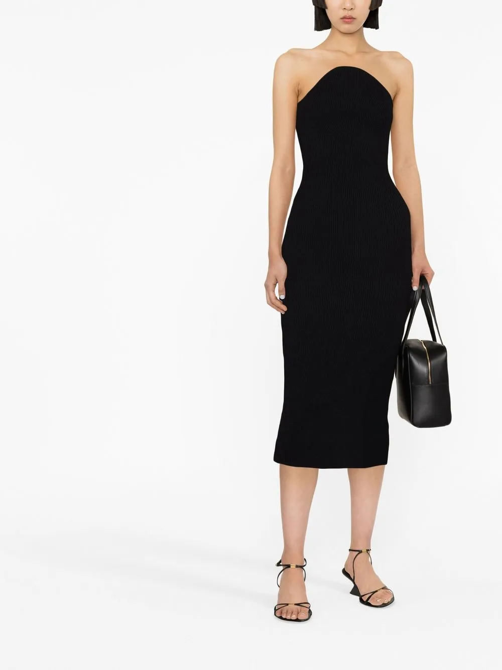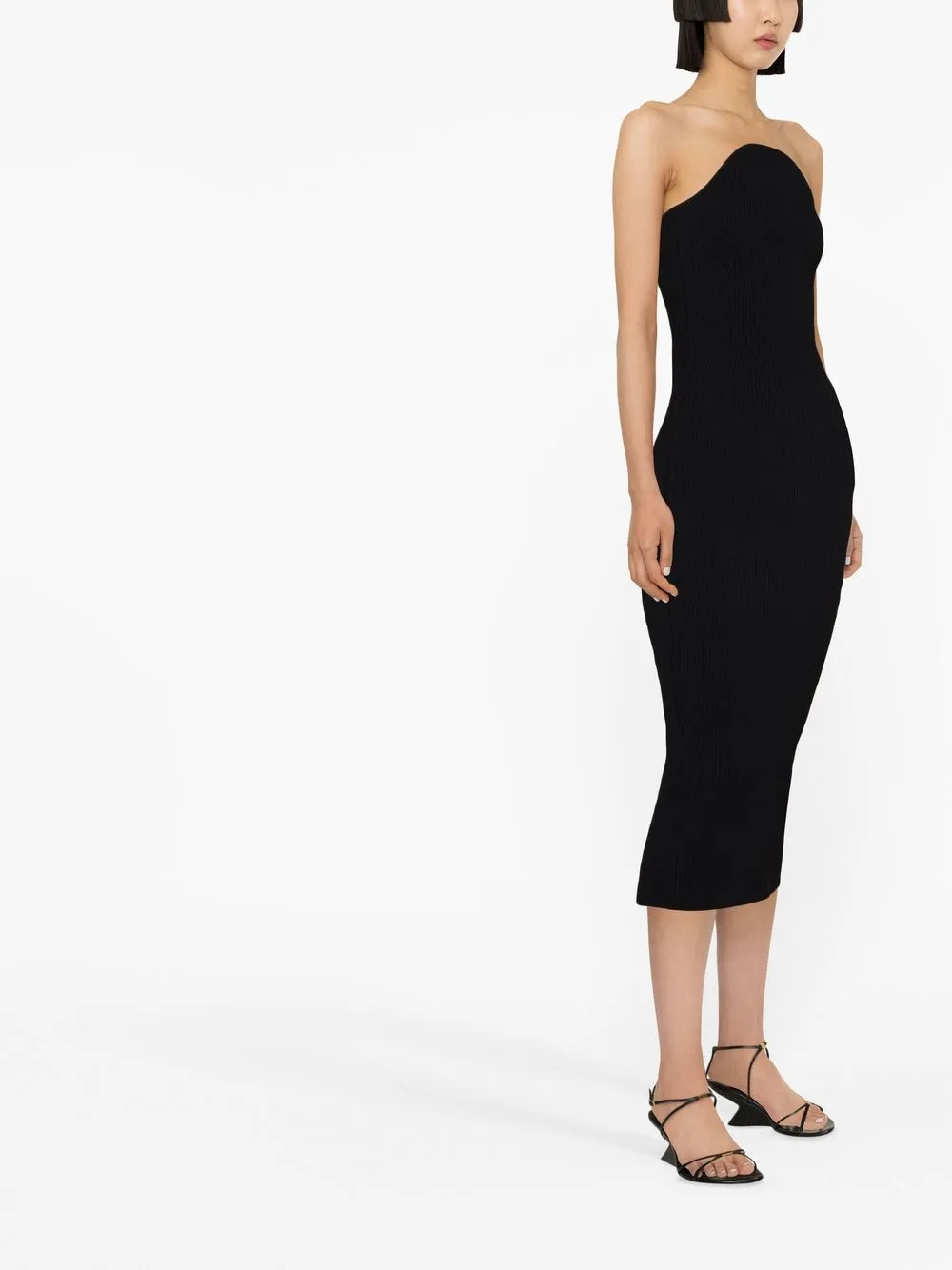 Черный, трикотаж в рубчик, асимметричный вырез, без бретелей, длина ниже колена и вырез сзади.