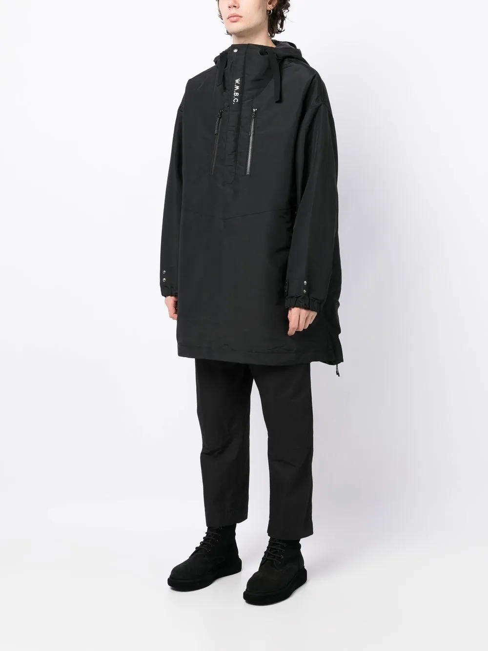 Черный, застежка на молнии спереди, два нагрудных кармана на молнии, вышитый логотип на груди, затягивающийся на шнурок капюшон, приспущенные плечи, длинные рукава, манжеты с ремешками, подол с кулиской и закругленный подол сзади.