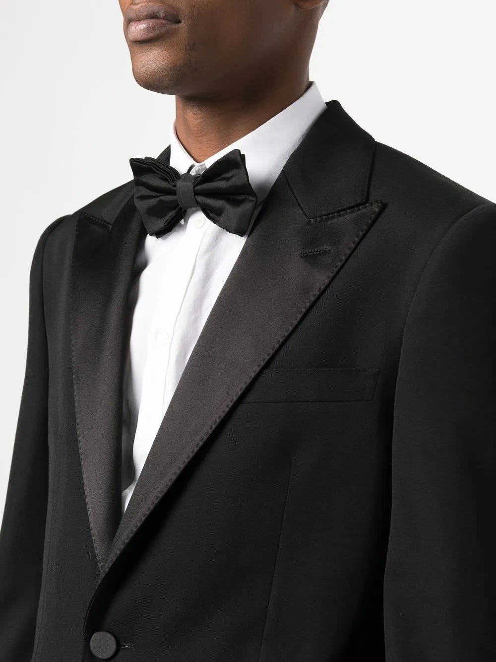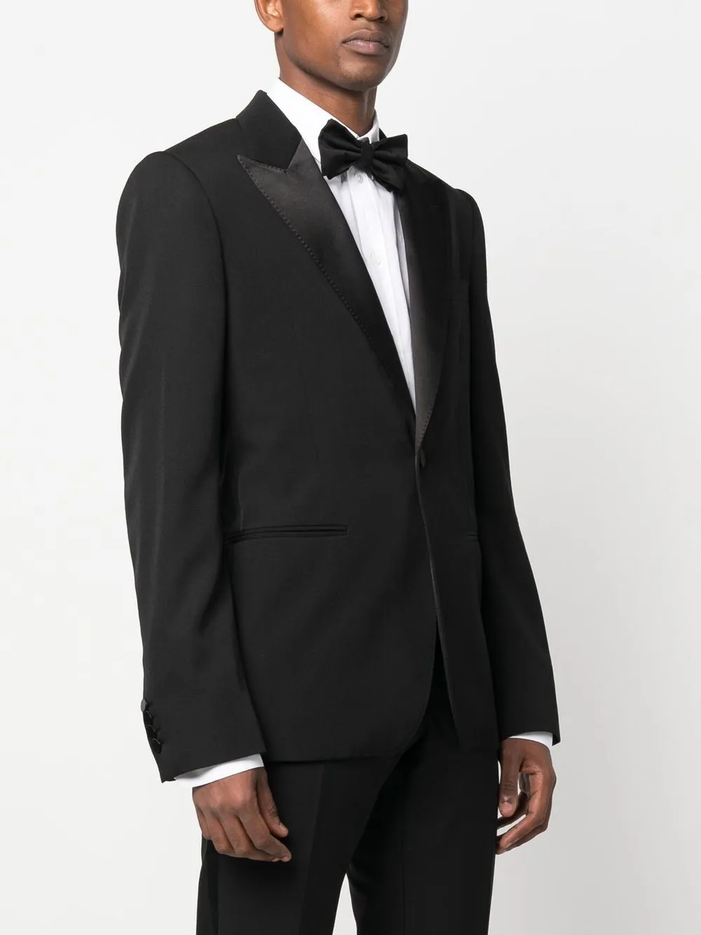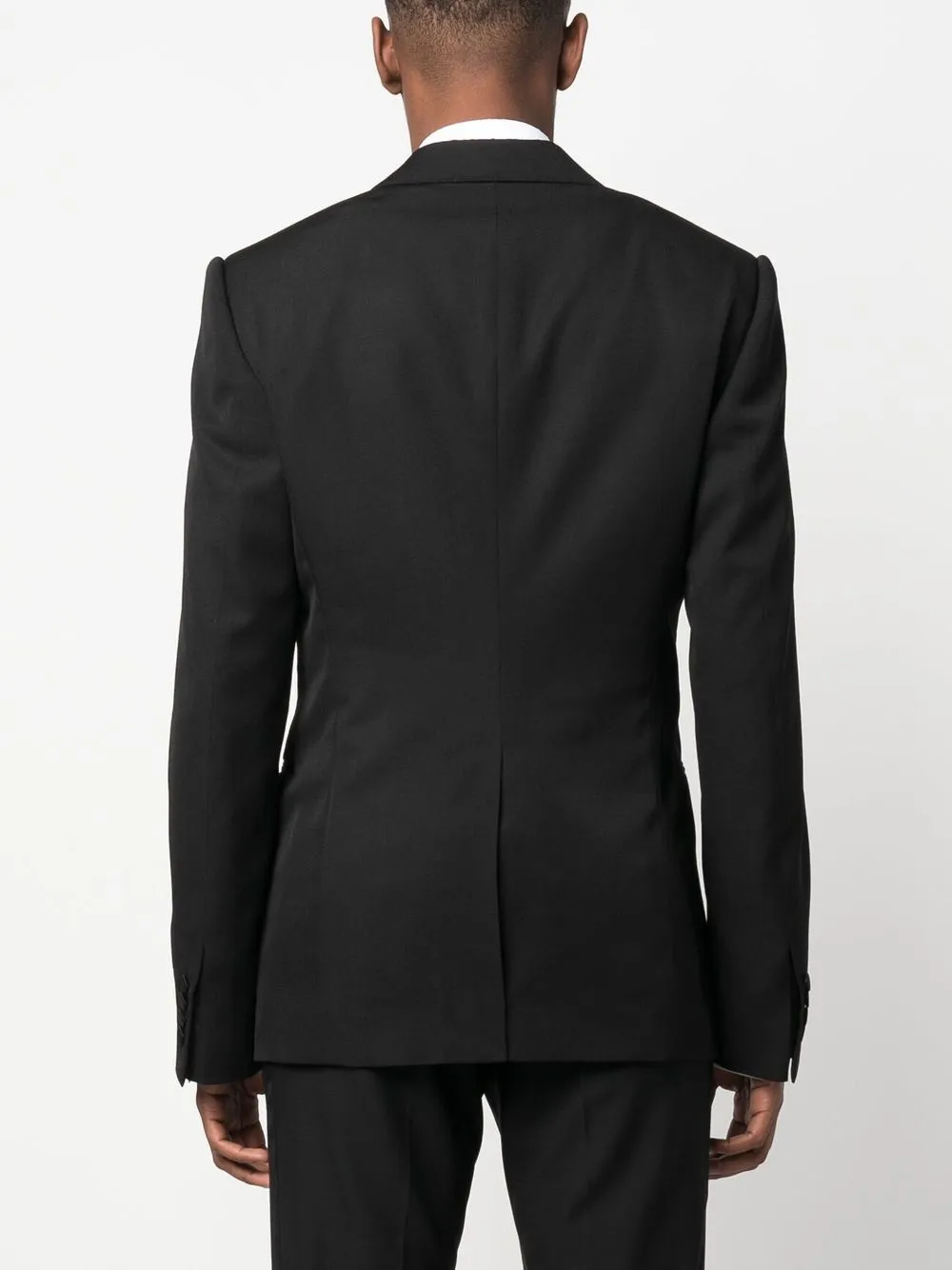 Черный, шерсть, шелк, хлопок, застежка на пуговицах спереди, контрастные лацканы, декоративная строчка, два передних кармана с листочкой, длинные рукава и манжеты на пуговицах.