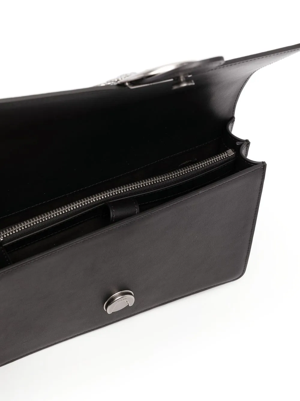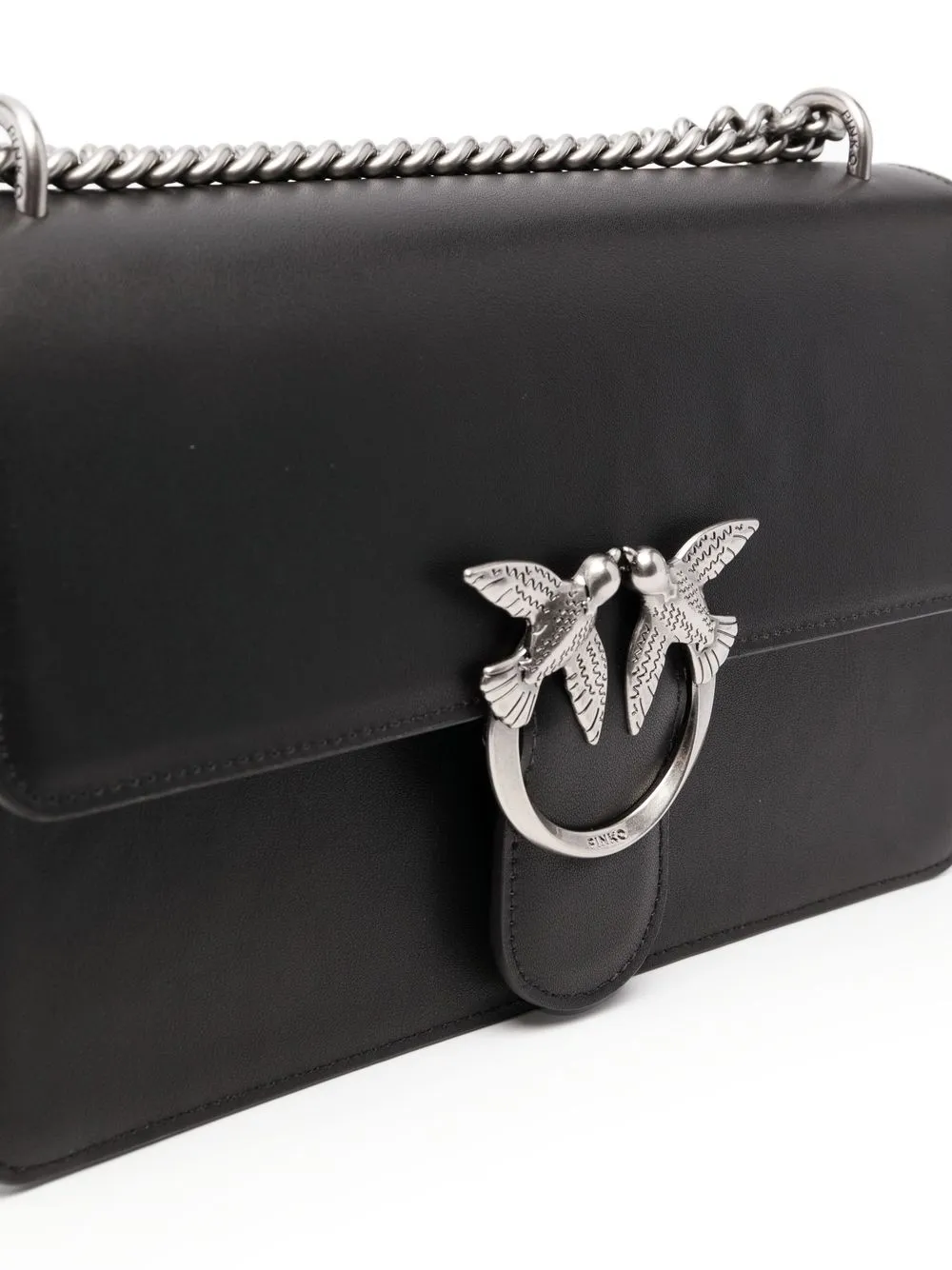 Черный, телячья кожа, пряжка Love Birds, серебристая фурнитура, регулируемый ремень-цепочка на плечо и откидной клапан.