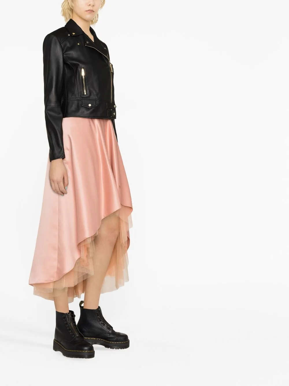 Черный, овечья кожа, отложный воротник, смещенная застежка на молнии спереди, два кармана на молнии, длинные рукава, прямой подол и укороченная длина.