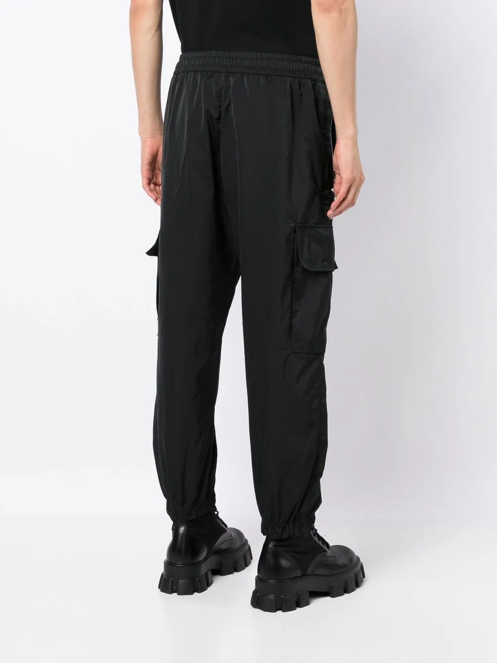 Черный, хлопок, средняя посадка, два кармана на молнии по бокам, кулиска на талии, два накладных кармана по бокам и зауженный крой.