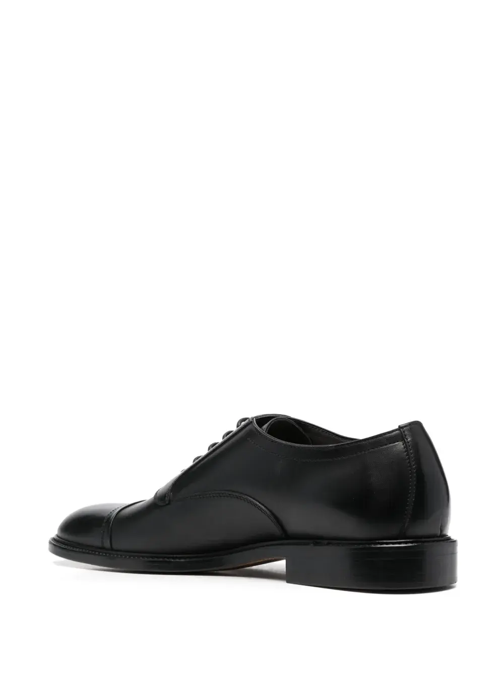 Черный, телячья кожа, миндалевидный носок, шнуровка спереди, низкий блочный каблук и кожаная стелька с логотипом.