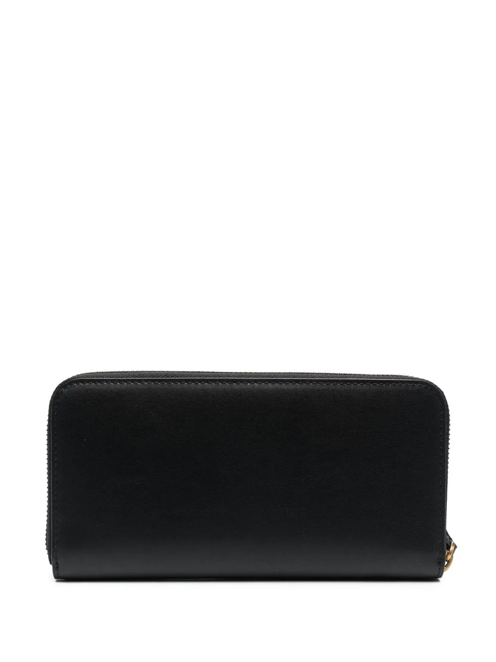 Черный, телячья кожа, золотистый металлический логотип, круговая молния, несколько отделений, внутренний карман на молнии и тисненый логотип внутри.