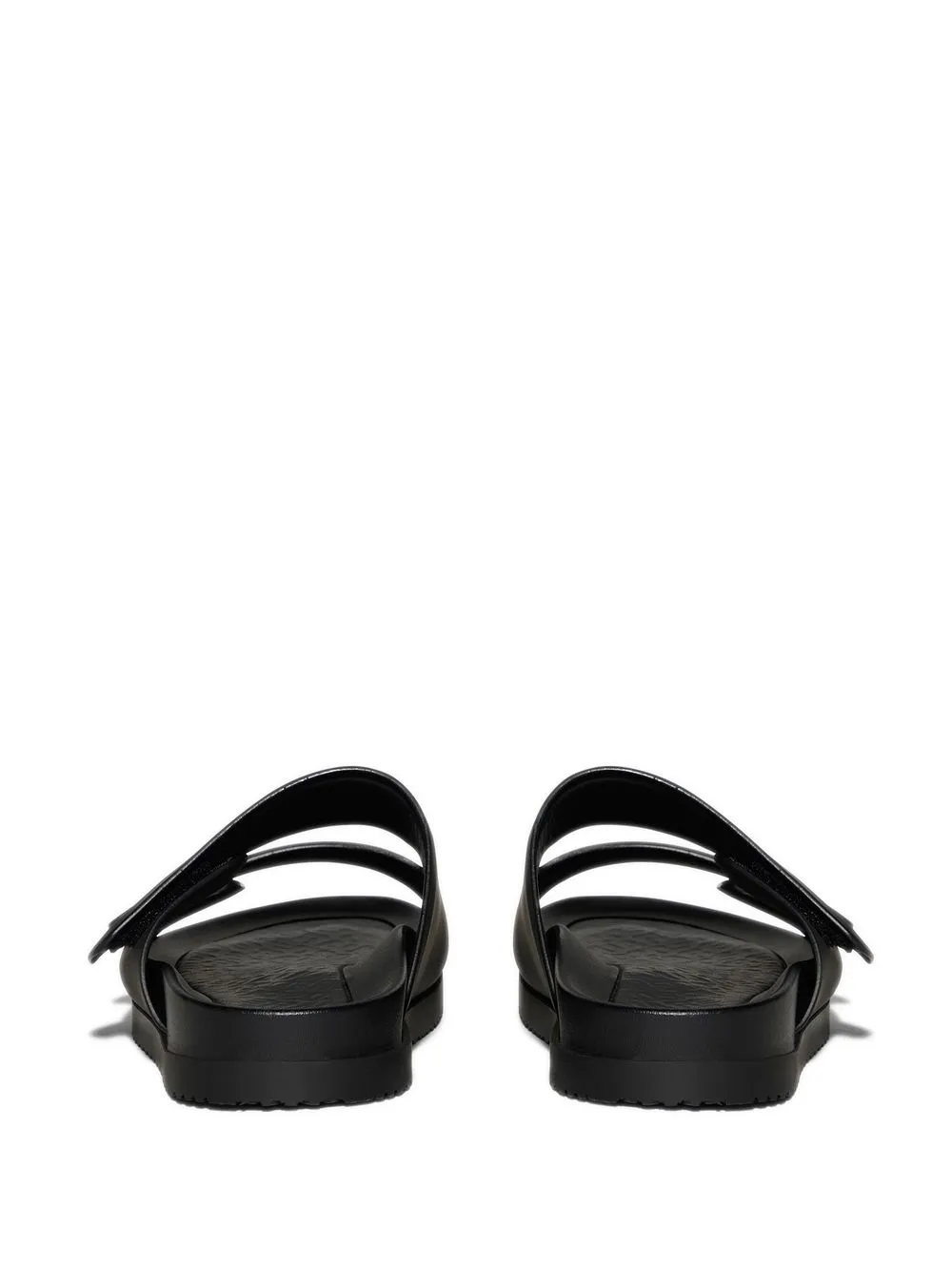 Черный, телячья кожа, ремешки с логотипом, открытый носок, открытая спина, застежка на липучке спереди, логотип на стельке и плоская подошва.
