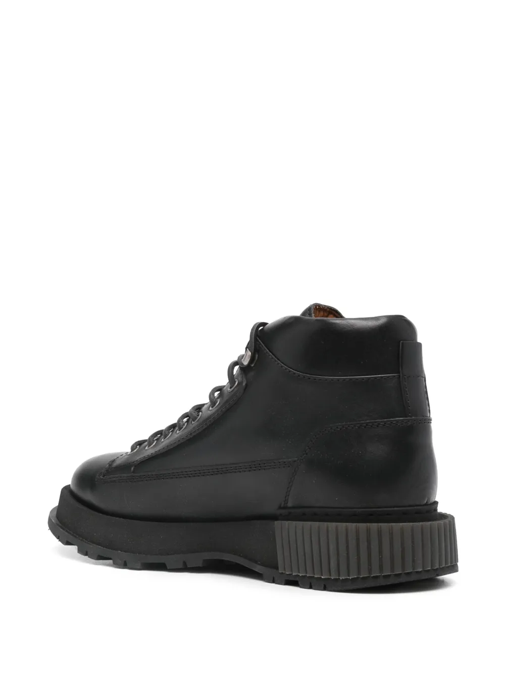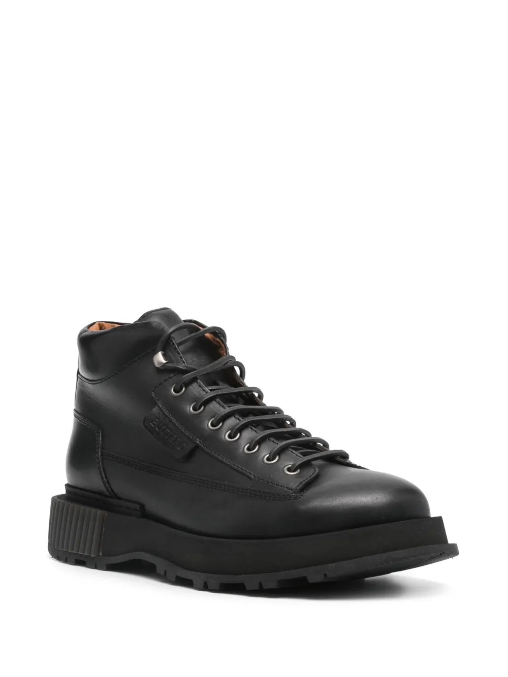 Тисненый логотип сбоку, петля для подтягивания сзади, высота по щиколотку, кожаная стелька с логотипом и массивная резиновая подошва.
