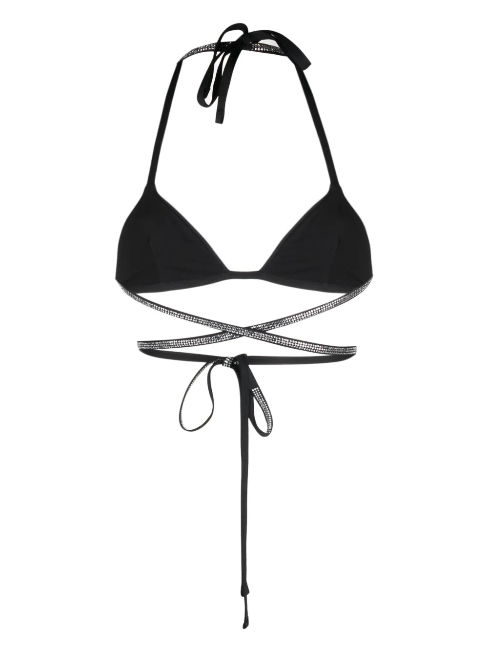 Черный, треугольная чашка, завязки вокруг шеи, несколько оборотов, украшения из горного хрусталя и жатый эффект. Пожалуйста, примеряйте купальники и пляжные шорты только поверх собственного белья.