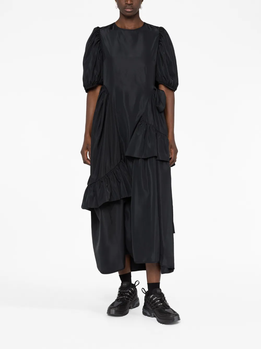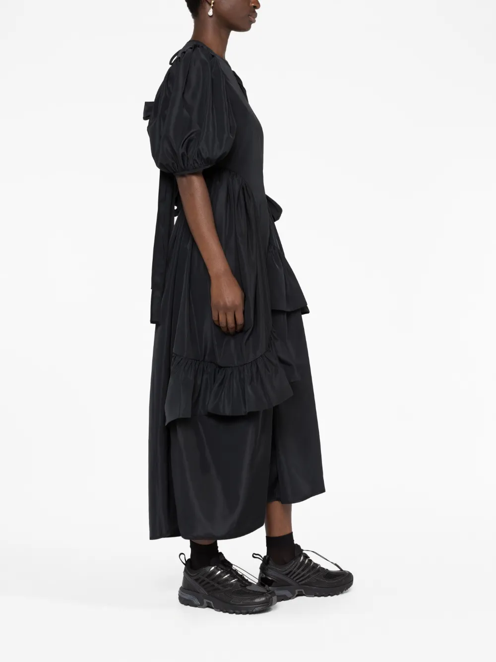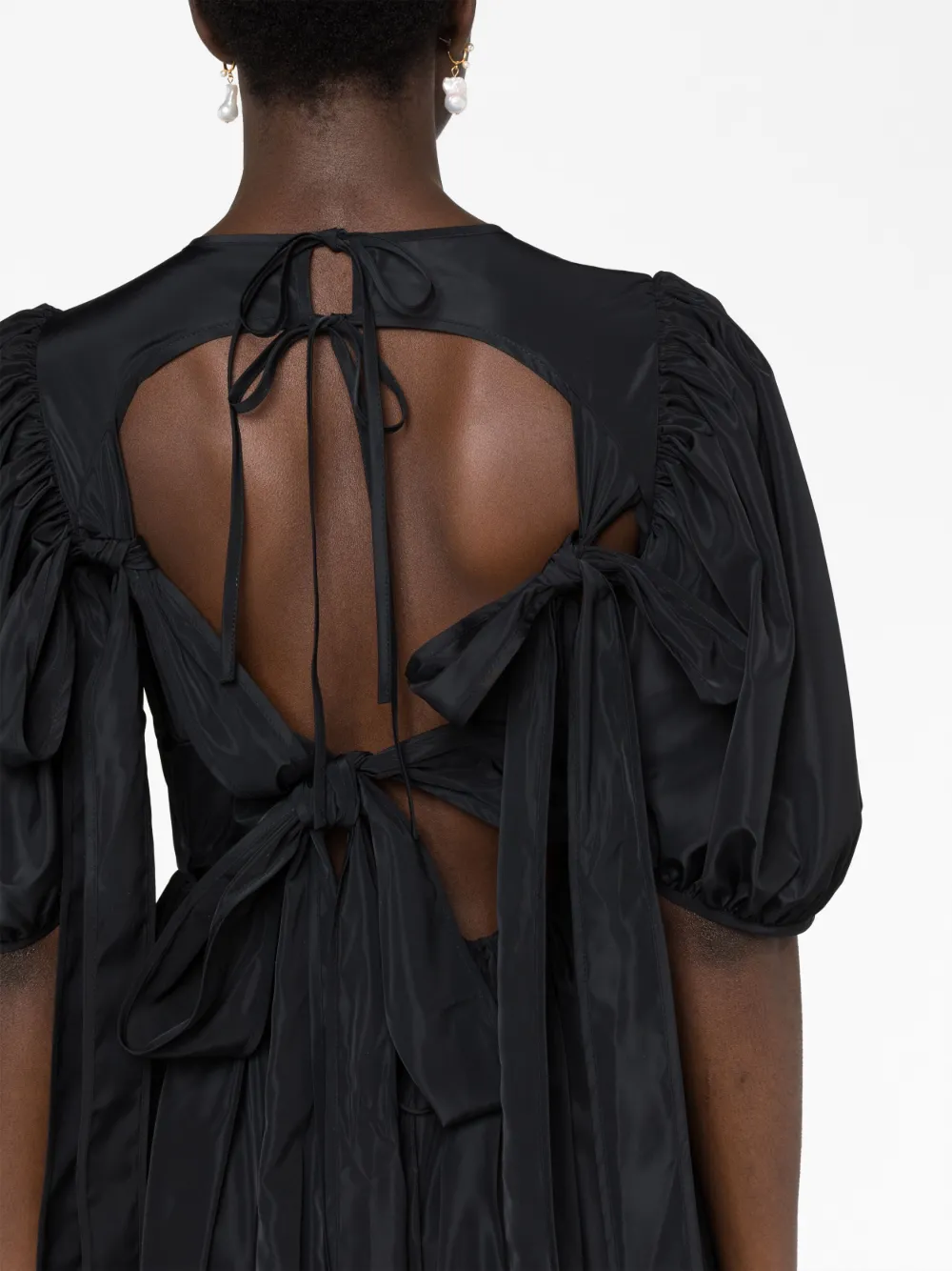 Черный, переработанный полиэстер, материал с эффектом матлассе, вырезные детали, вставки с оборками, круглый вырез, короткие объемные рукава, шнуровка сзади и длина до середины голени. Этот товар как минимум на 50% состоит из переработанных или повторно использованных материалов.