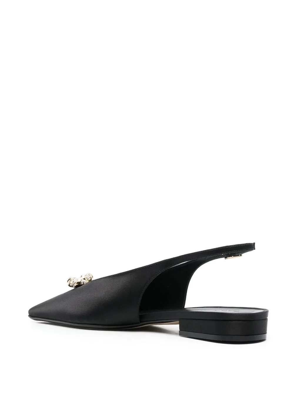 Черный, телячья кожа, металлический декор, заостренный носок, ремешок на пятке с пряжкой и плоская подошва.