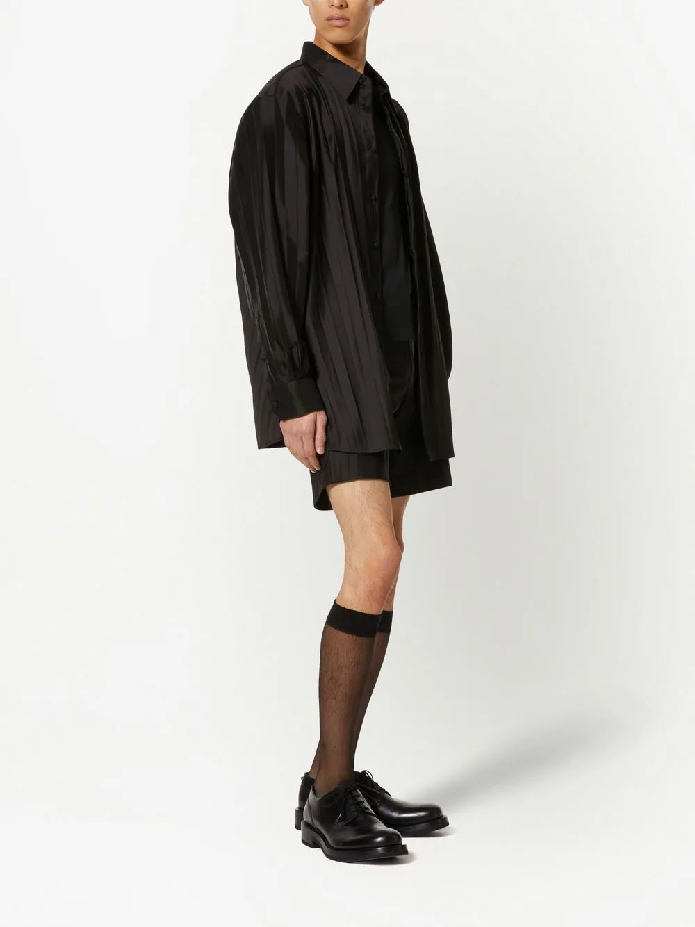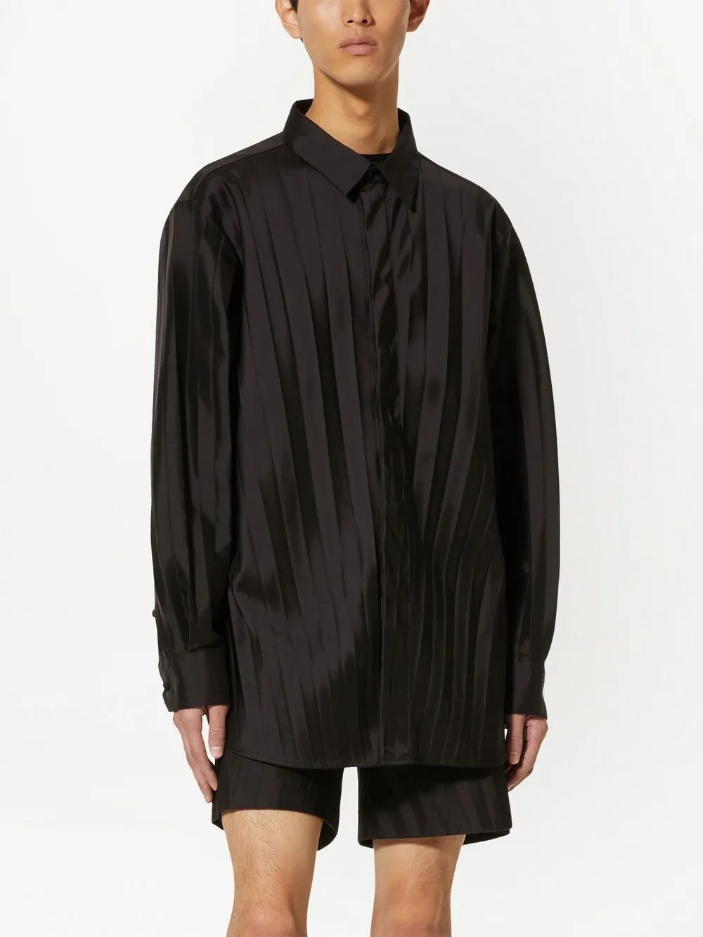 Коллекция Valentino Ready To Wear, коричневый, сатиновая фактура, плиссированная модель, классический воротник, потайная пуговичная застежка спереди, длинные рукава, манжеты на пуговицах и дужки с закругленными концами. Образ включает аксессуары Valentino Garavani.