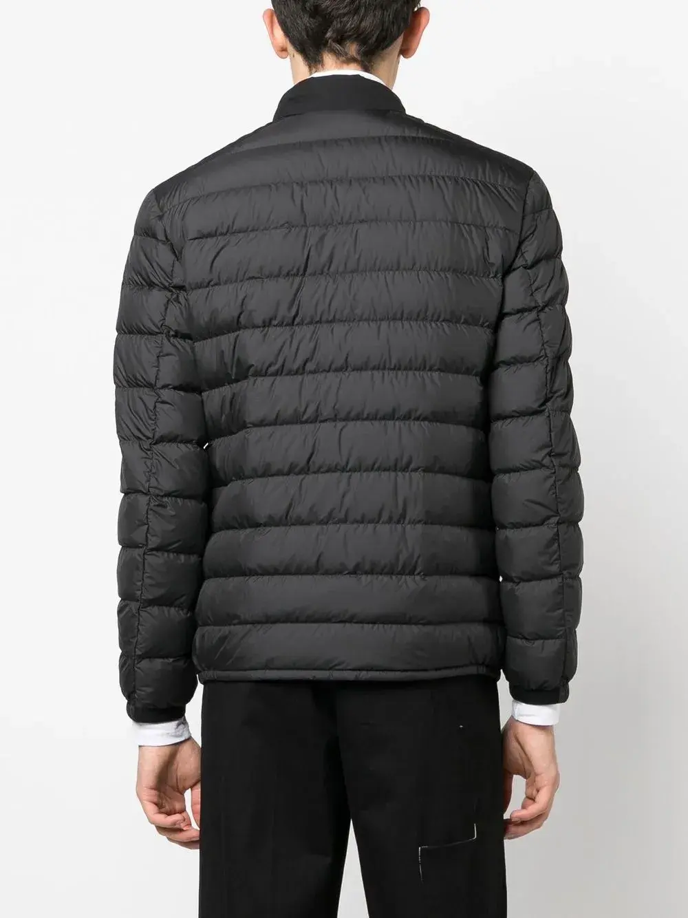Черный, наполнитель из пуха и перьев, стеганая модель, высокий воротник, длинные рукава, застежка на молнии спереди и два кармана на молнии по бокам.