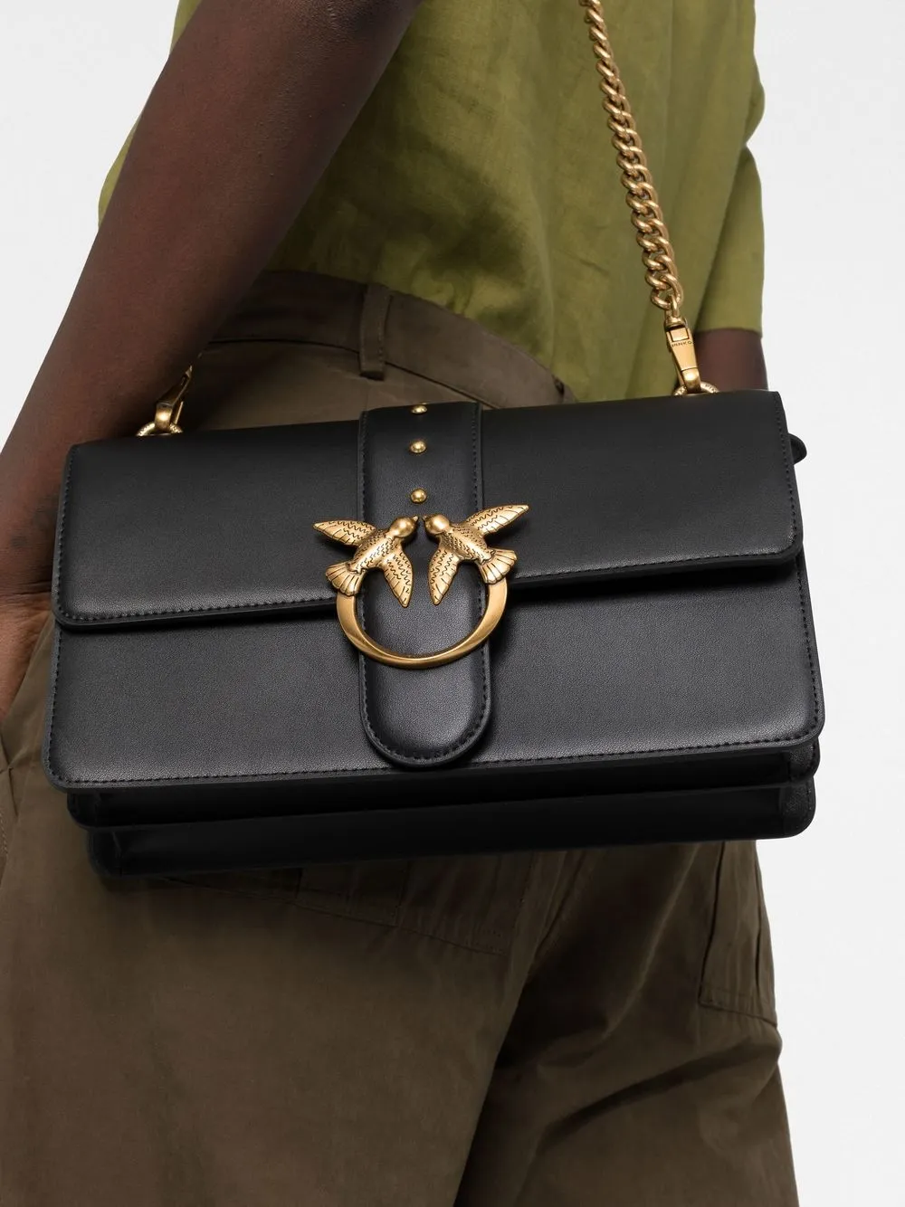 Черный, телячья кожа, золотистая фурнитура, пряжка Love Birds, откидной клапан на магните, несколько отделений, внутренний карман на молнии и съемный регулируемый ремень на плечо.