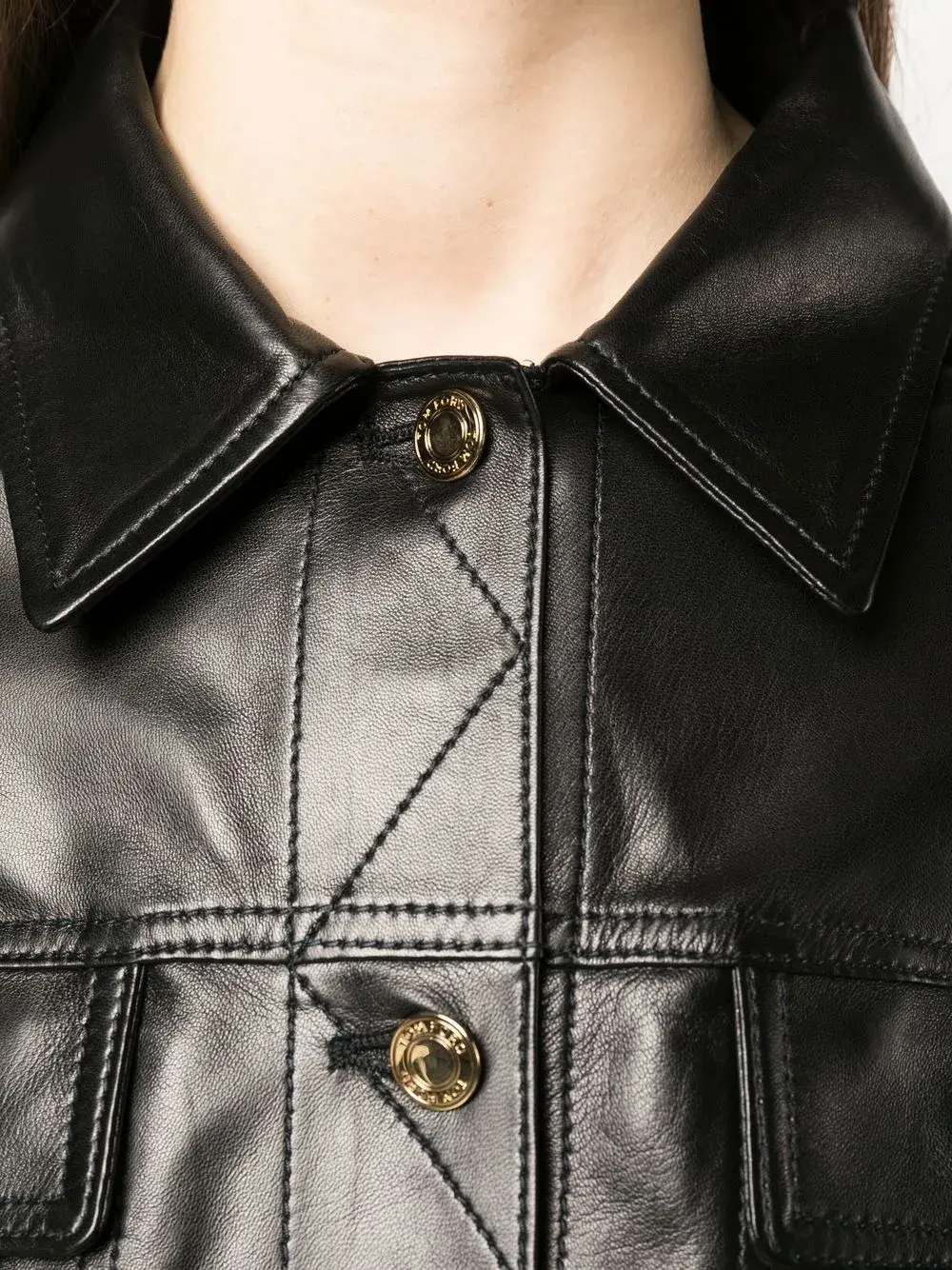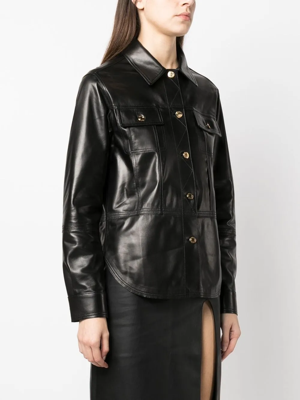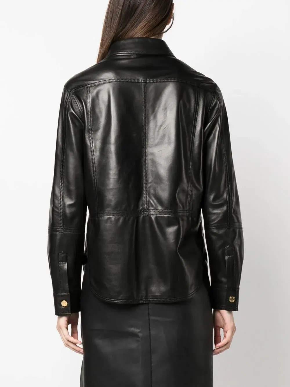 Черный, телячья кожа, отложной воротник, планка на пуговицах спереди, два нагрудных кармана с клапанами, швы, закругленный подол, длинные рукава и манжеты на пуговицах.