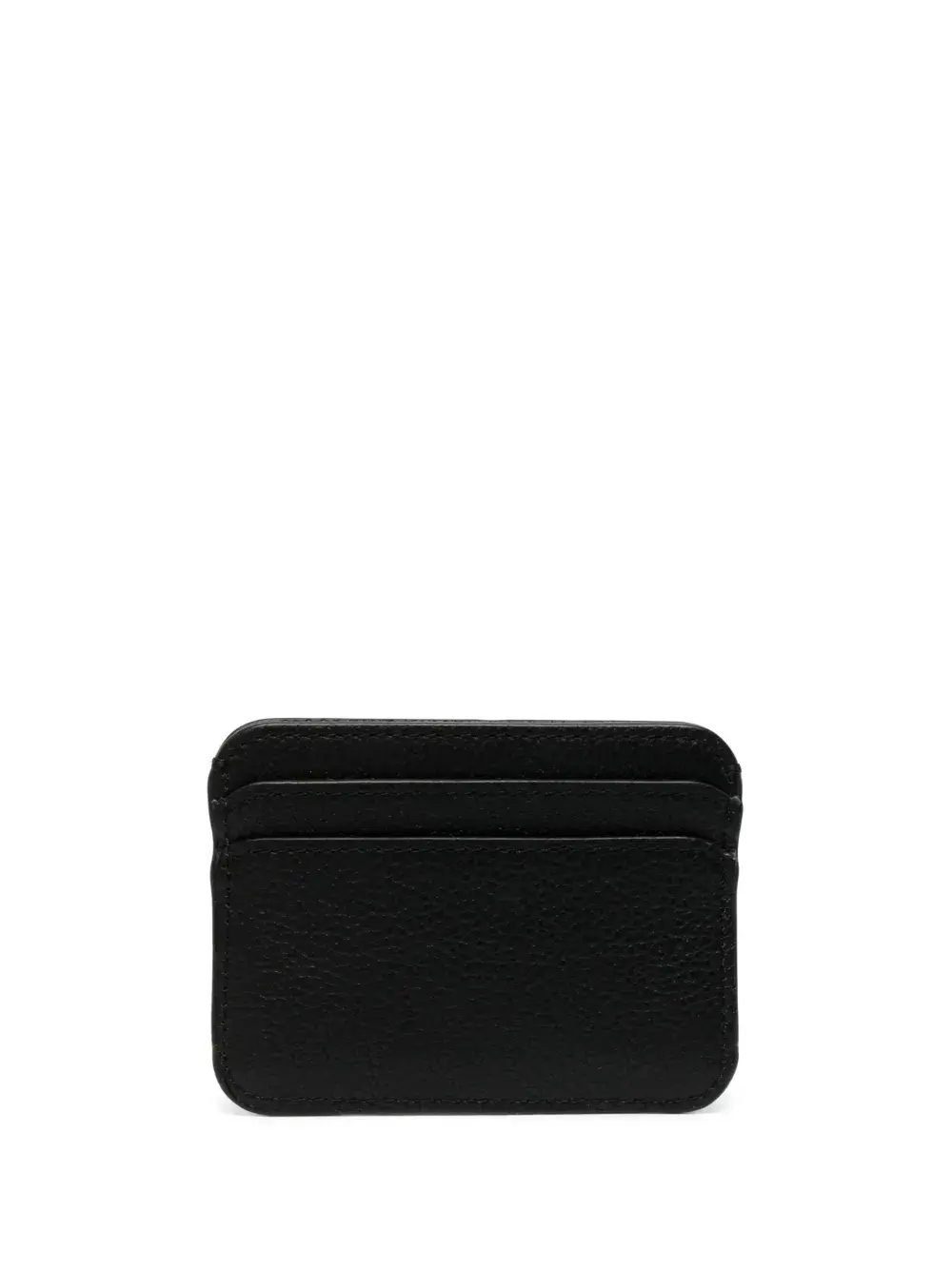 Черный, телячья кожа, зернистая текстура, строчка в тон, золотистый металлический логотип, отделения для карт и тисненый логотип внутри.