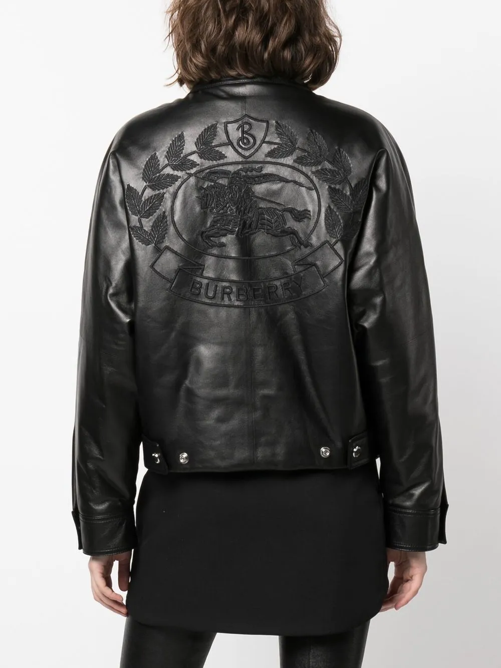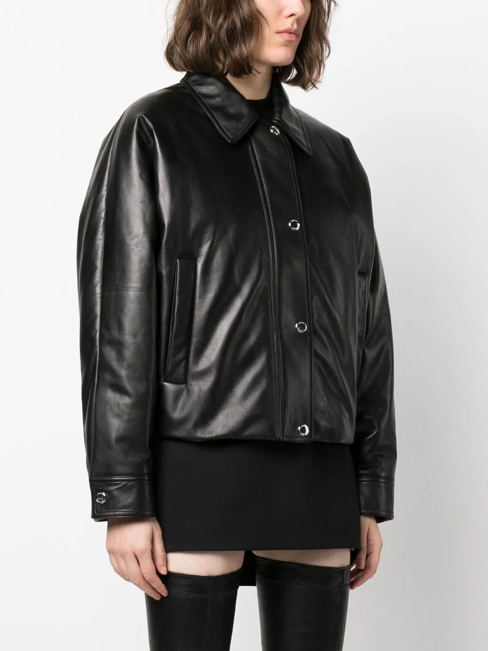 Черный, овечья кожа, отложной воротник, застежка на пуговицах спереди, длинные рукава, два прорезных кармана по бокам и прямой подол.