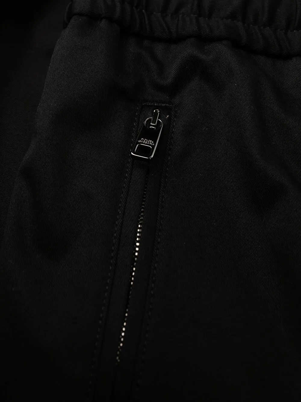 Черный, эластичный хлопок, серебристый металлический логотип, кулиска на талии, два прорезных кармана по бокам и два кармана на молнии сзади.