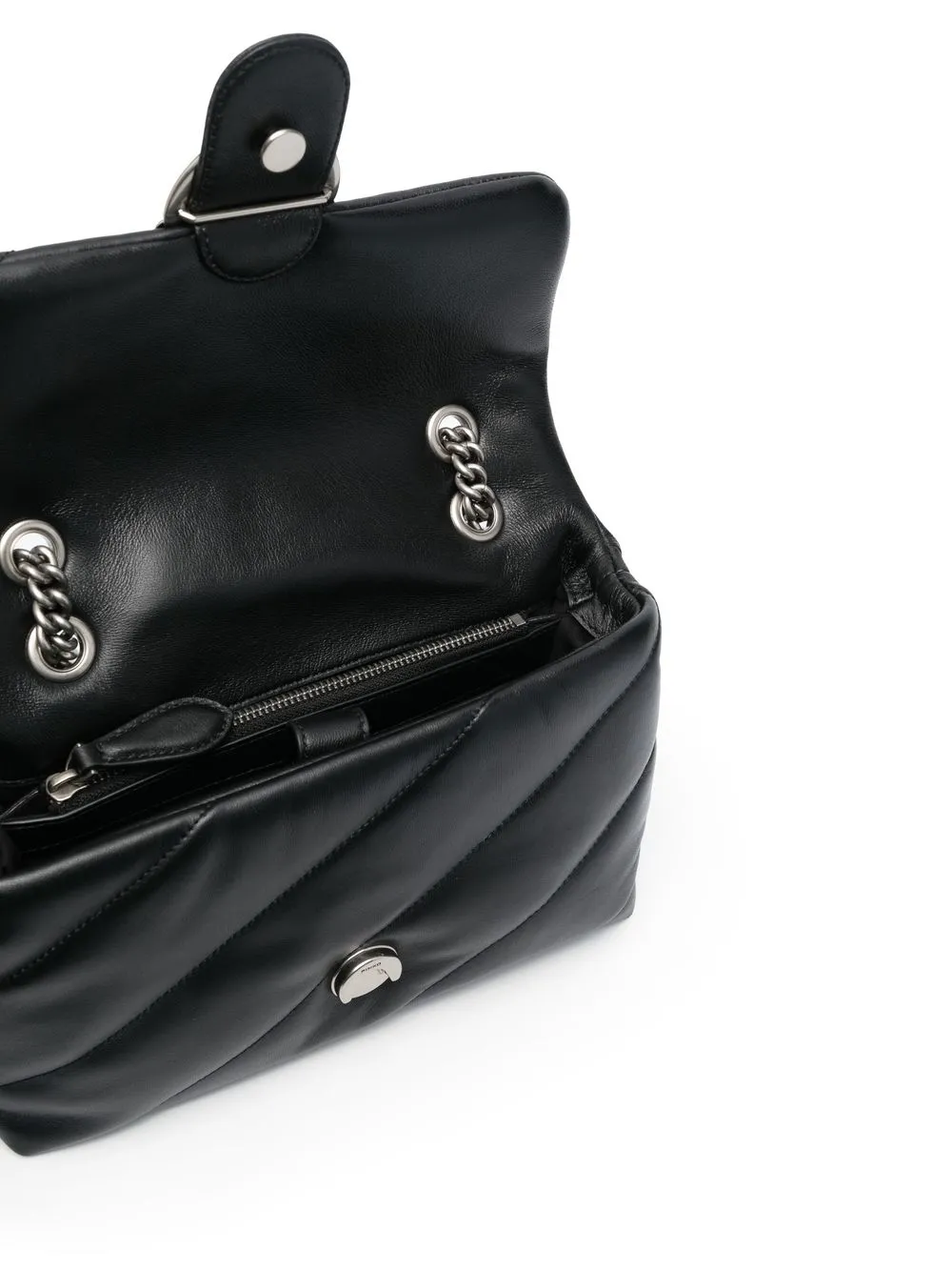 Черный, телячья кожа, стеганая отделка, пряжка Love Birds, ремешок-цепочка на плечо, откидной клапан на магните, основное отделение, внутренний карман на молнии и серебристая фурнитура.