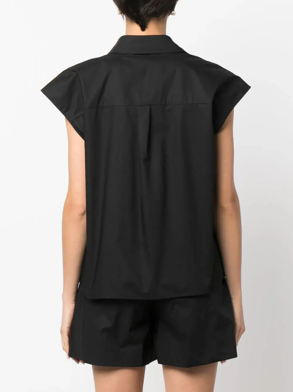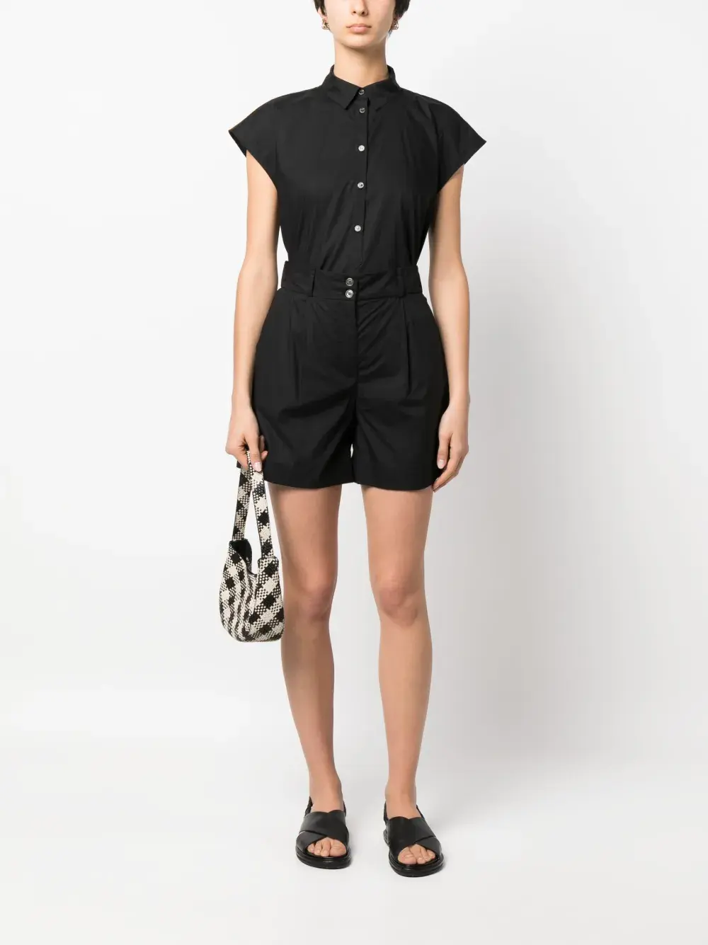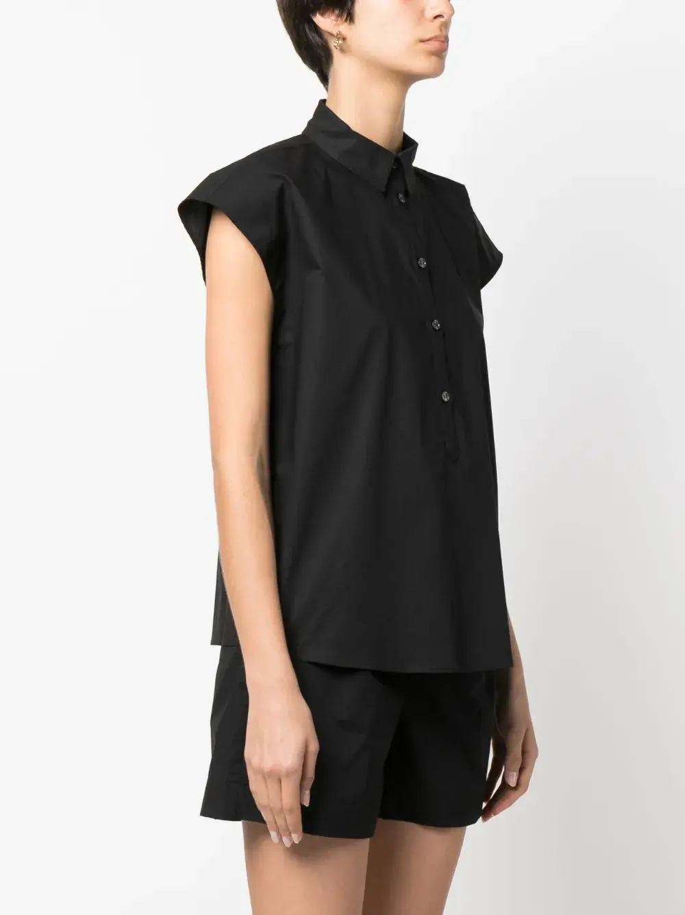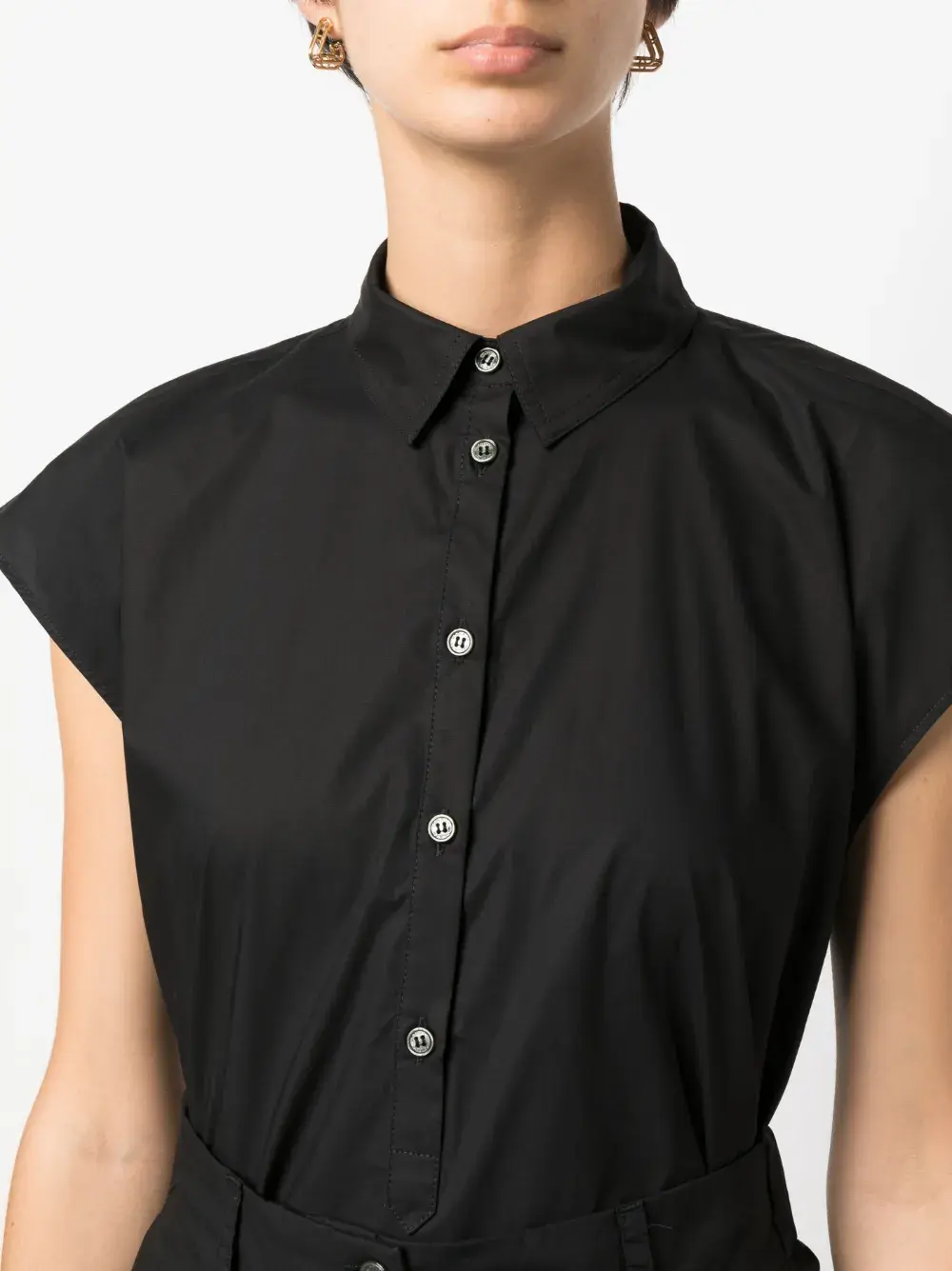 Черный, хлопок, классический воротник, застежка на пуговицах спереди, рукава кап и прямой подол.