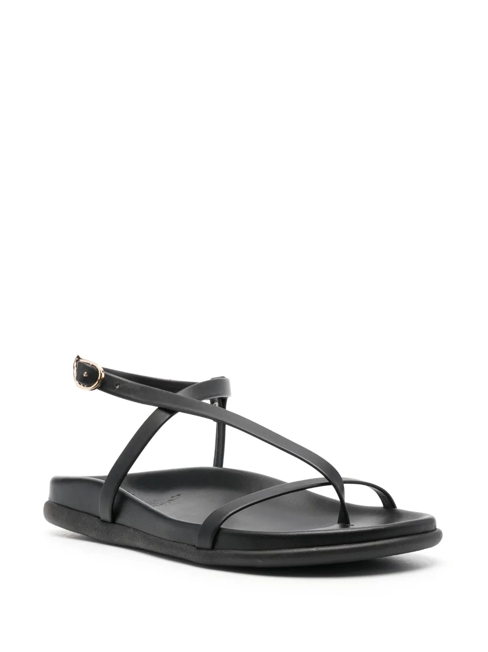 Черный, телячья кожа, перекрестные ремешки, ремешок на щиколотке с пряжкой, формованная стелька и плоская резиновая подошва.