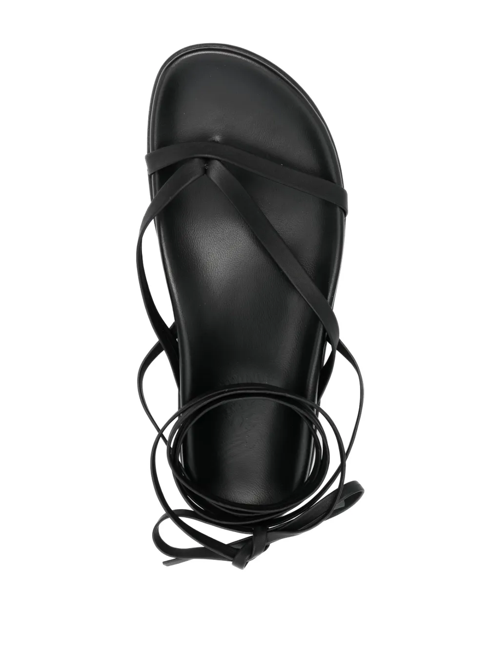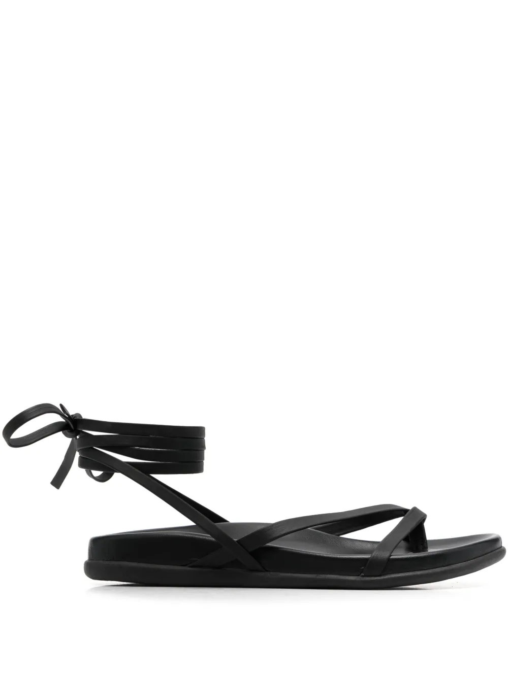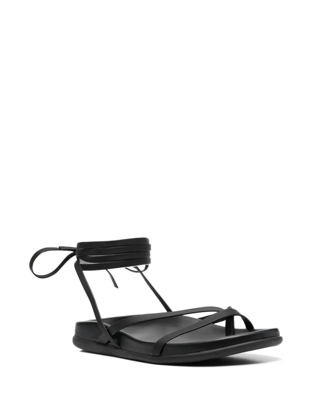 Черный, телячья кожа, открытый носок, завязка на щиколотке, формованная стелька, несколько вариантов крепления ремня, плоская резиновая подошва и закругленный носок.
