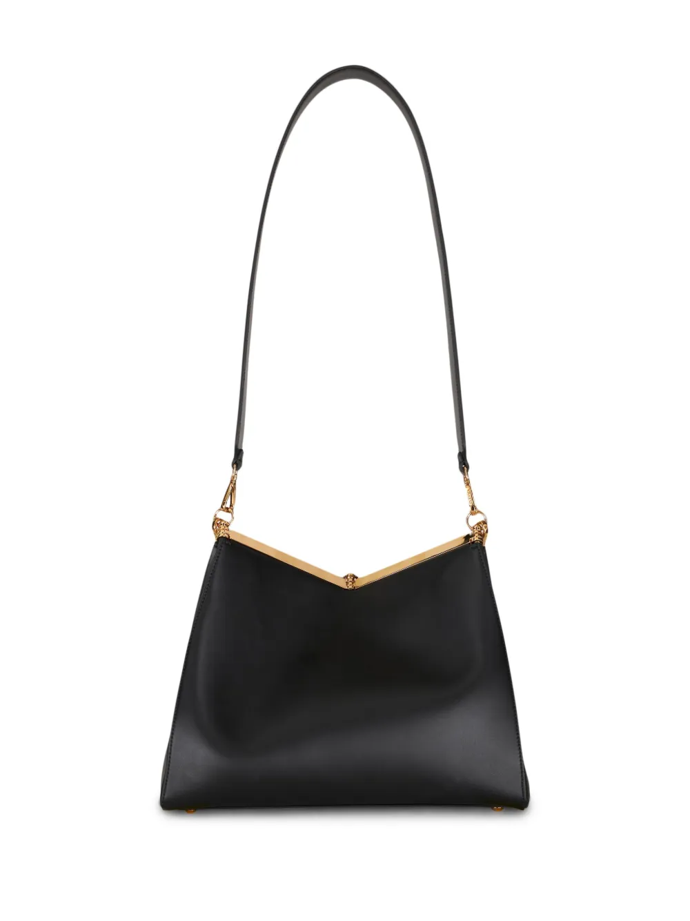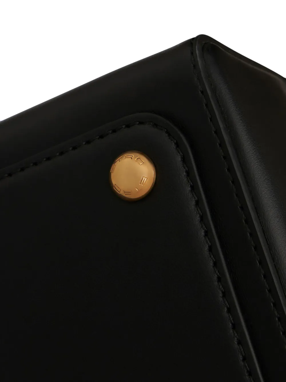 Черный, телячья кожа, металлический каркас, узор Pegaso, подвеска с логотипом, съемный ремень на плечо, верхняя ручка, застежка на зажиме и металлические ножки.