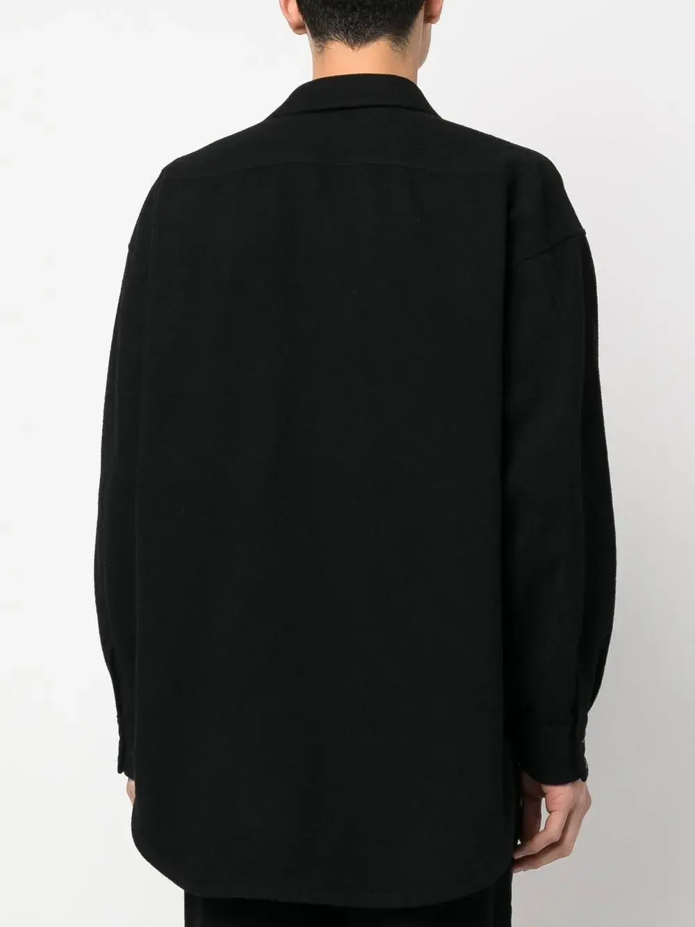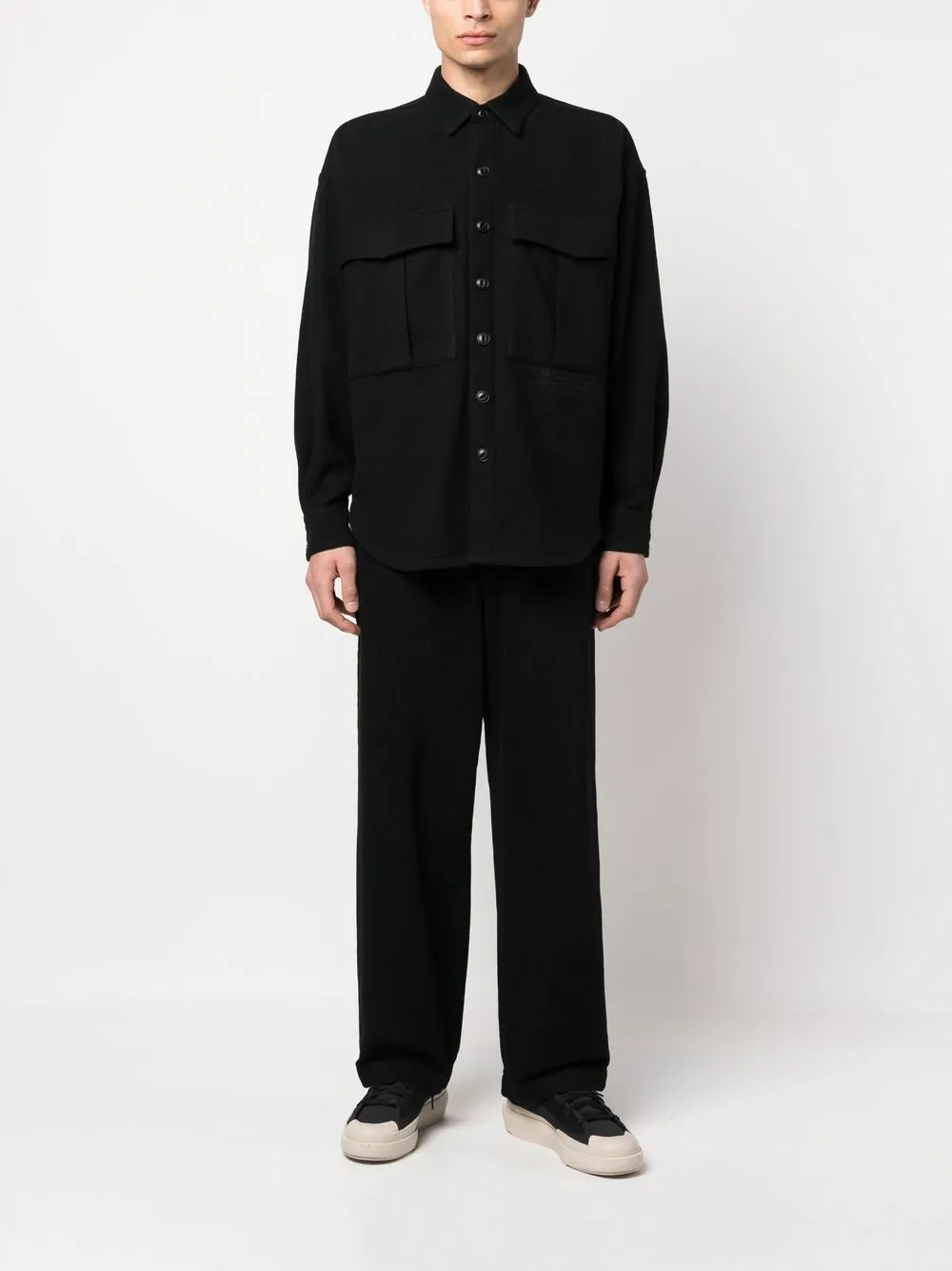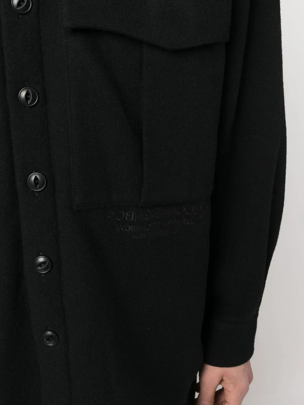 Черный, смесовая шерсть, классический воротник, застежка на пуговицах спереди, два нагрудных кармана с клапанами, длинные рукава, манжеты на пуговицах и закругленный подол.