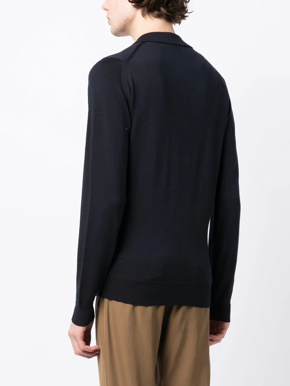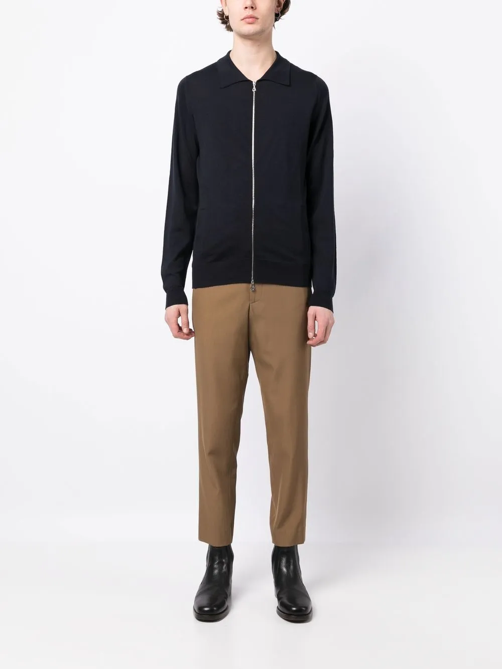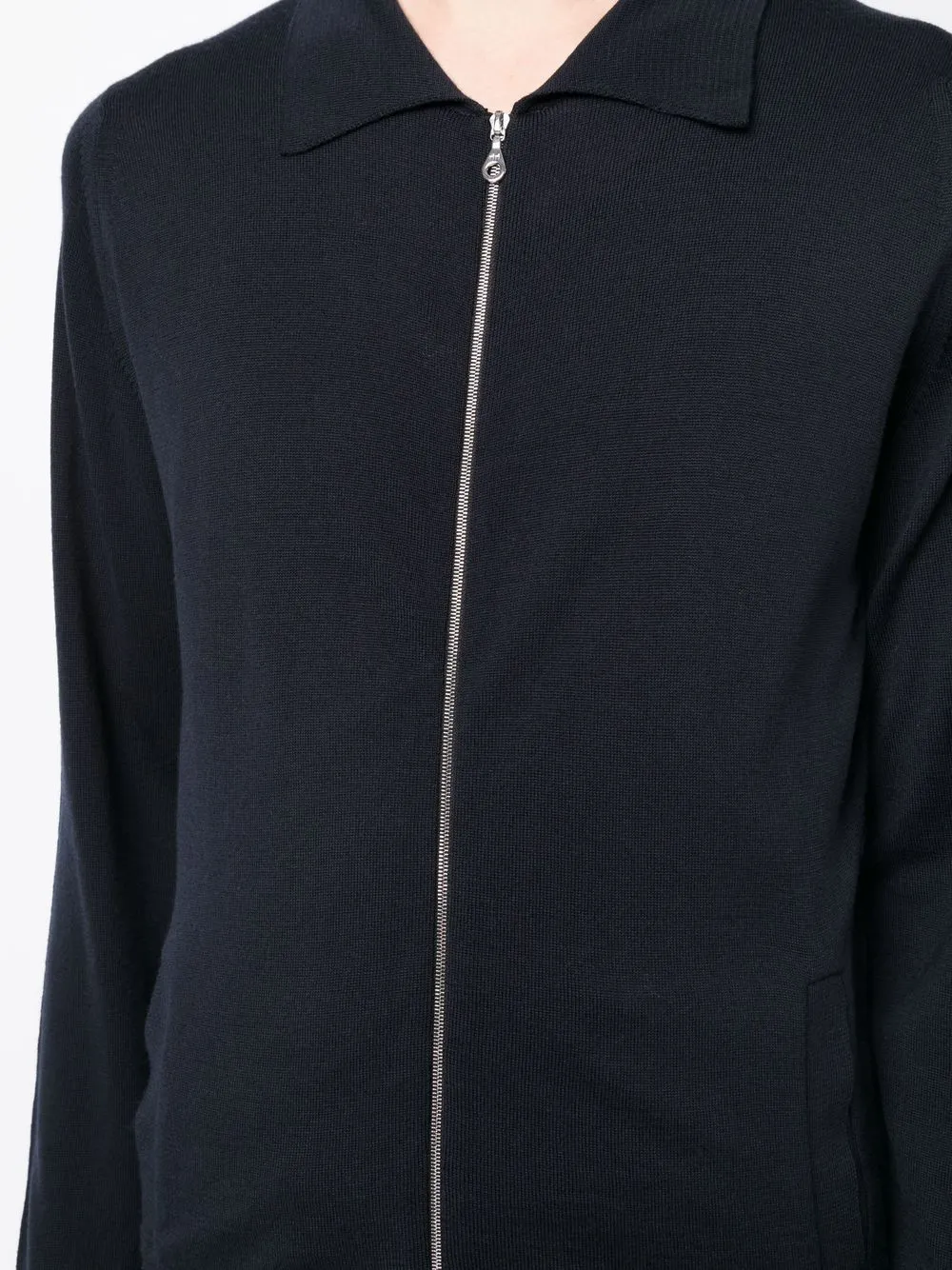 Черный, шерсть мериноса, трикотажный материал, классический воротник, застежка на молнии спереди, длинные рукава и прямой подол.