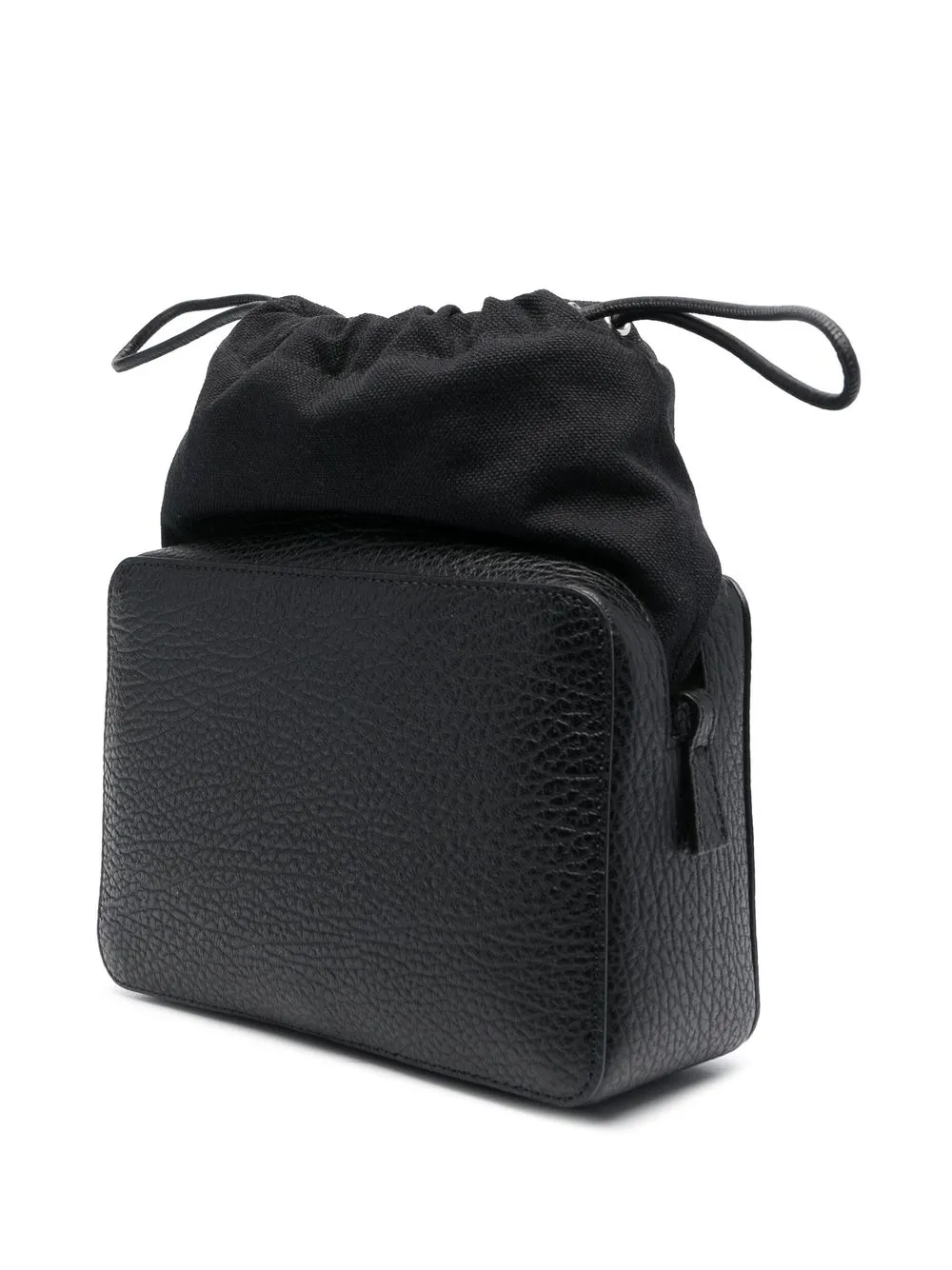 Черный, телячья кожа, хлопок, зернистая текстура, вставки, нашивка с логотипом спереди, съемный ремень на плечо, кулиска и основное отделение.