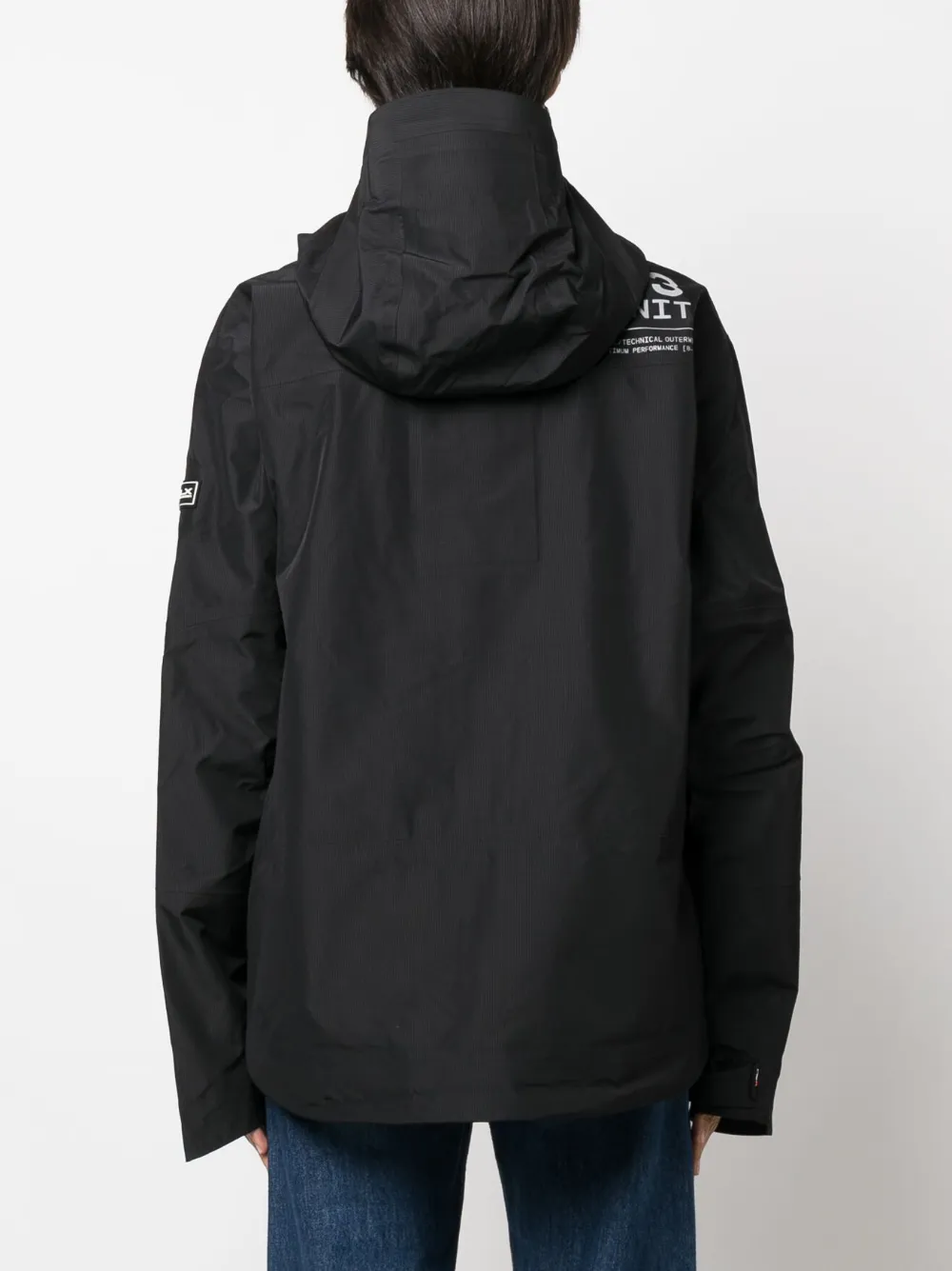 Черный, нашивка с логотипом спереди, нашивка с логотипом на рукаве, нашивка с логотипом сзади, воротник-стойка, двусторонняя молния спереди, длинные рукава, классический капюшон, передние карманы на молнии и закругленный подол сзади.