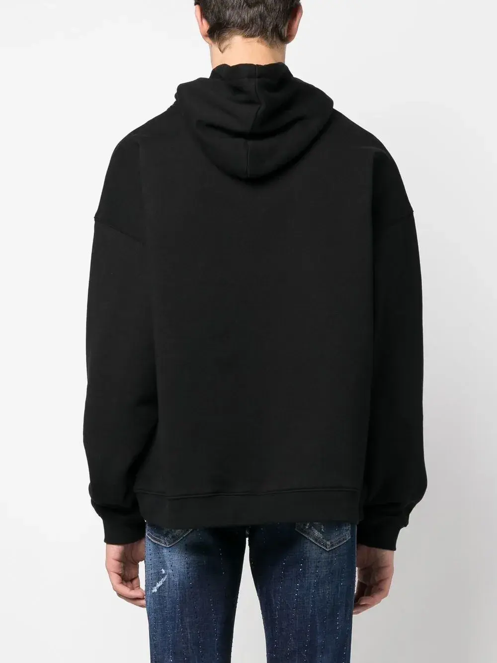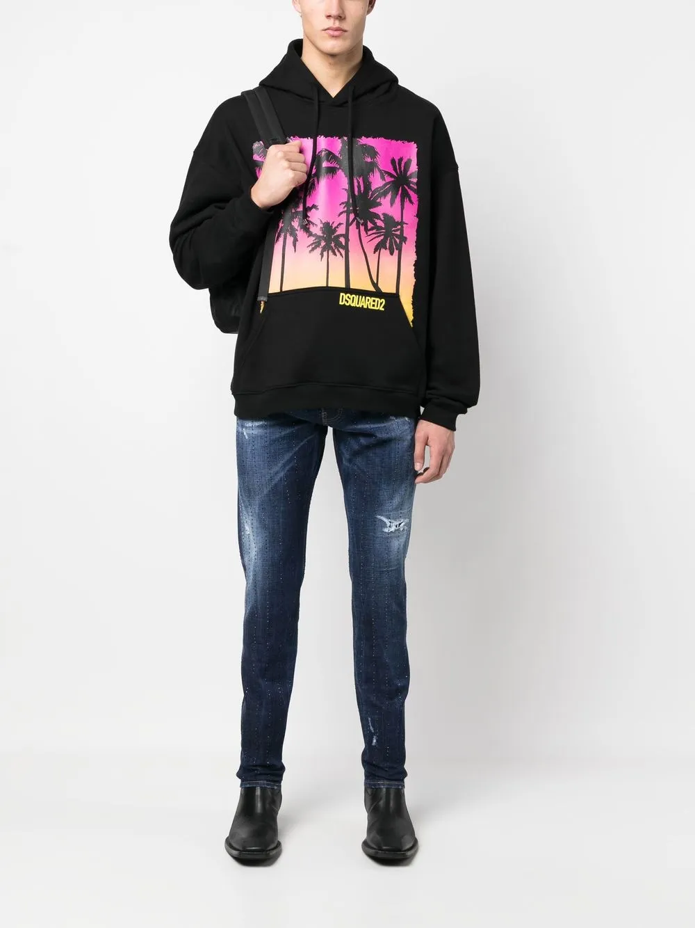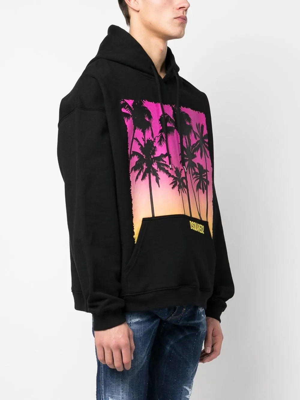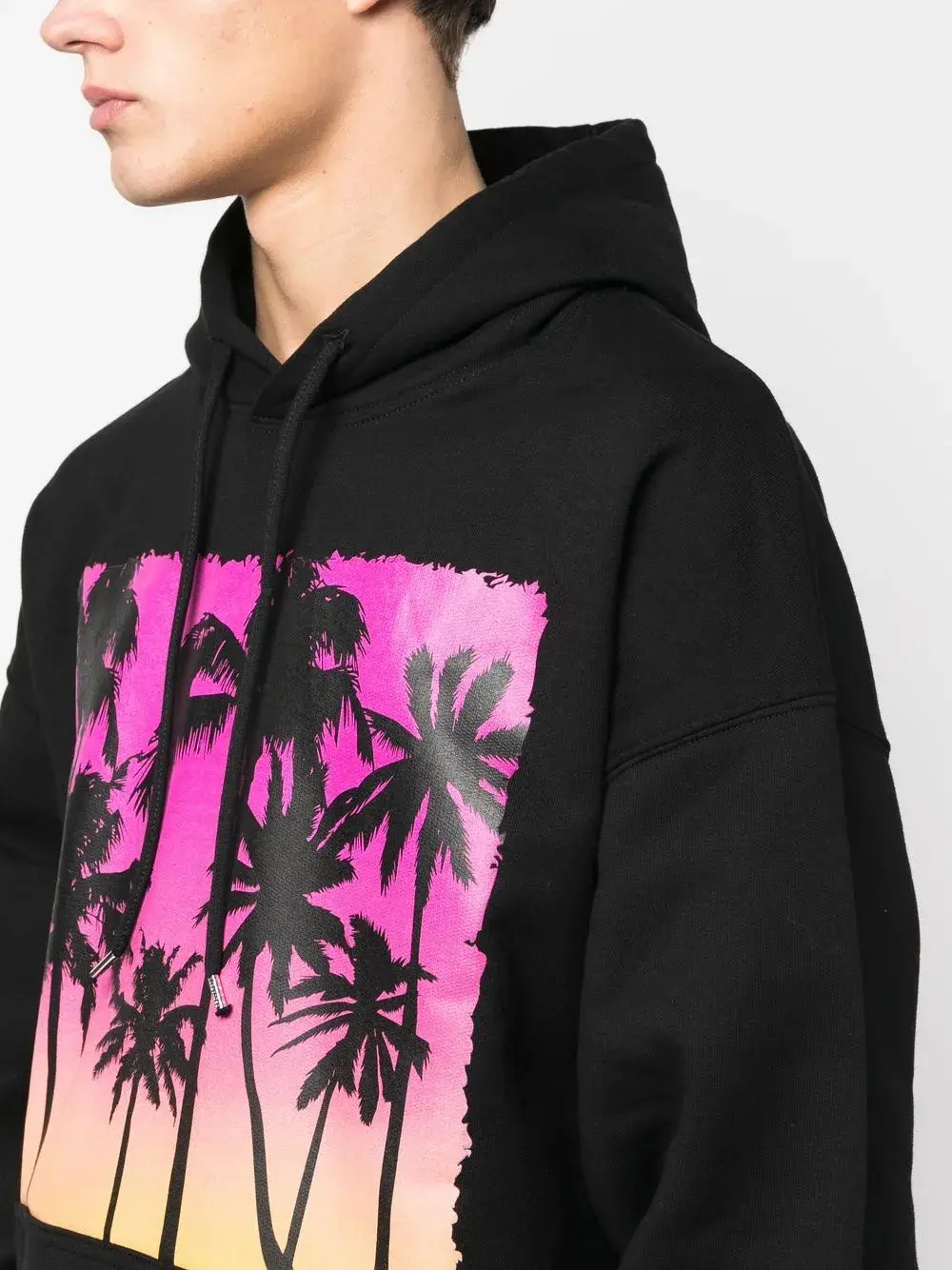 Черный, хлопок, принт с изображением пальм, затягивающийся на шнурок капюшон, логотип спереди, карман-муфта, удлиненные рукава и подол в рубчик.