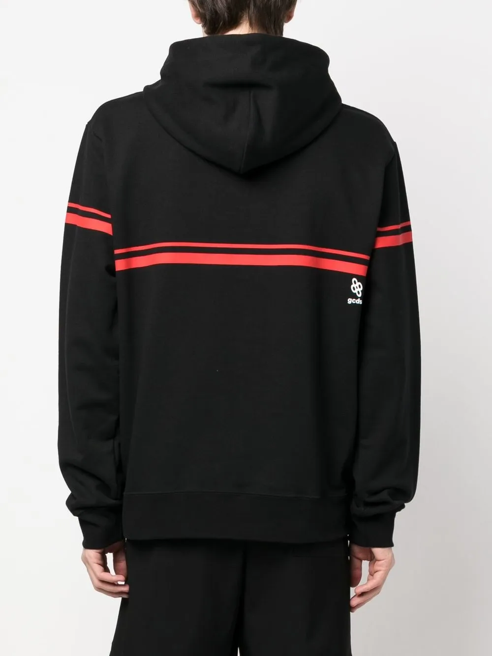 Черный, красный, хлопок, полоски, принт с логотипом на груди, затягивающийся на шнурок капюшон, карман-муфта, длинные рукава, манжеты в рубчик и подол в рубчик.
