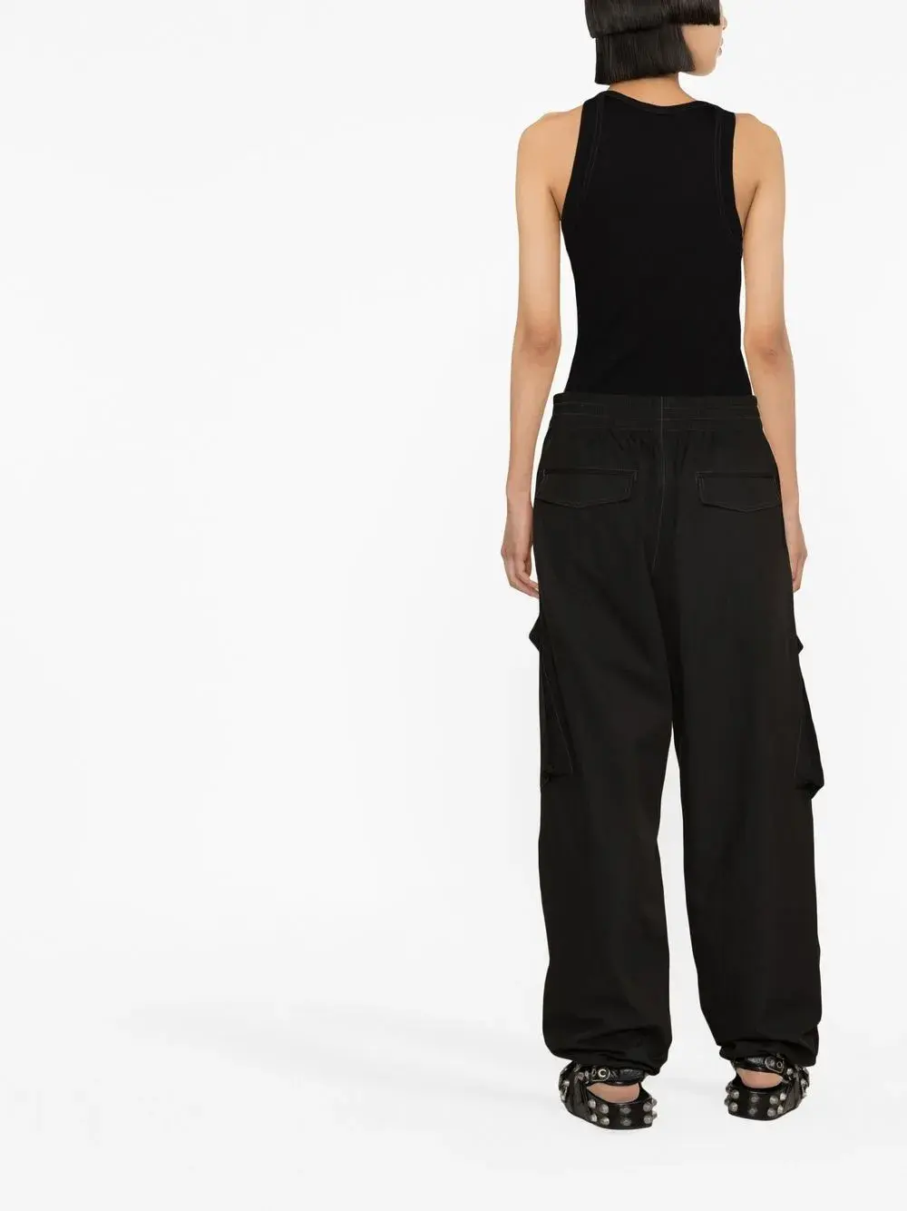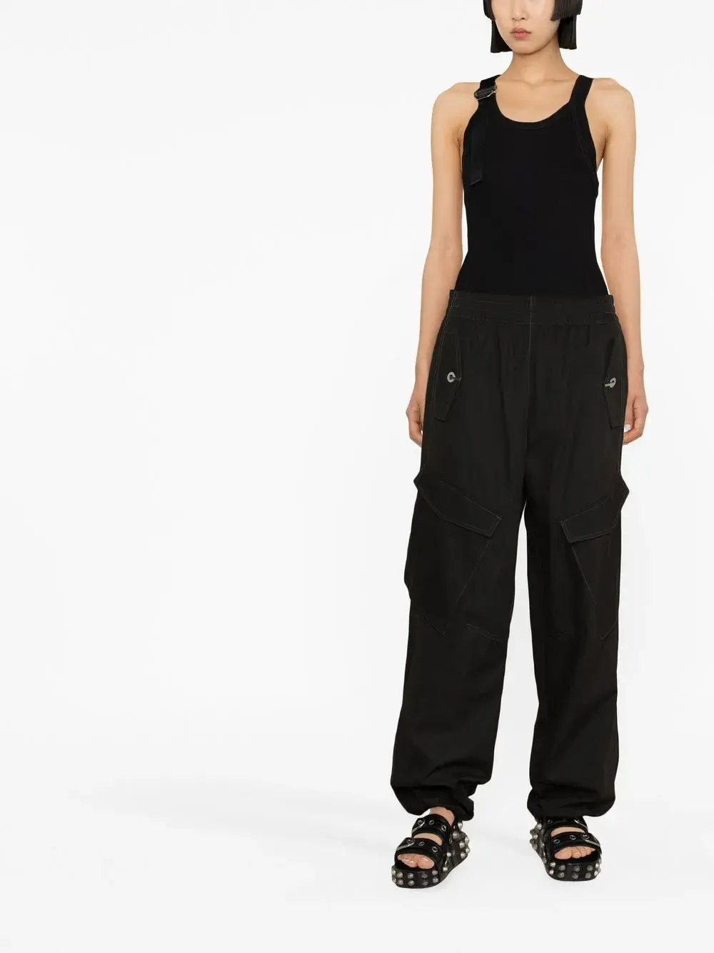 Черный, органический хлопок, эластичный материал, детали в рубчик, застежка на пряжке, U-образный вырез и прямой подол. Ответственный выбор: