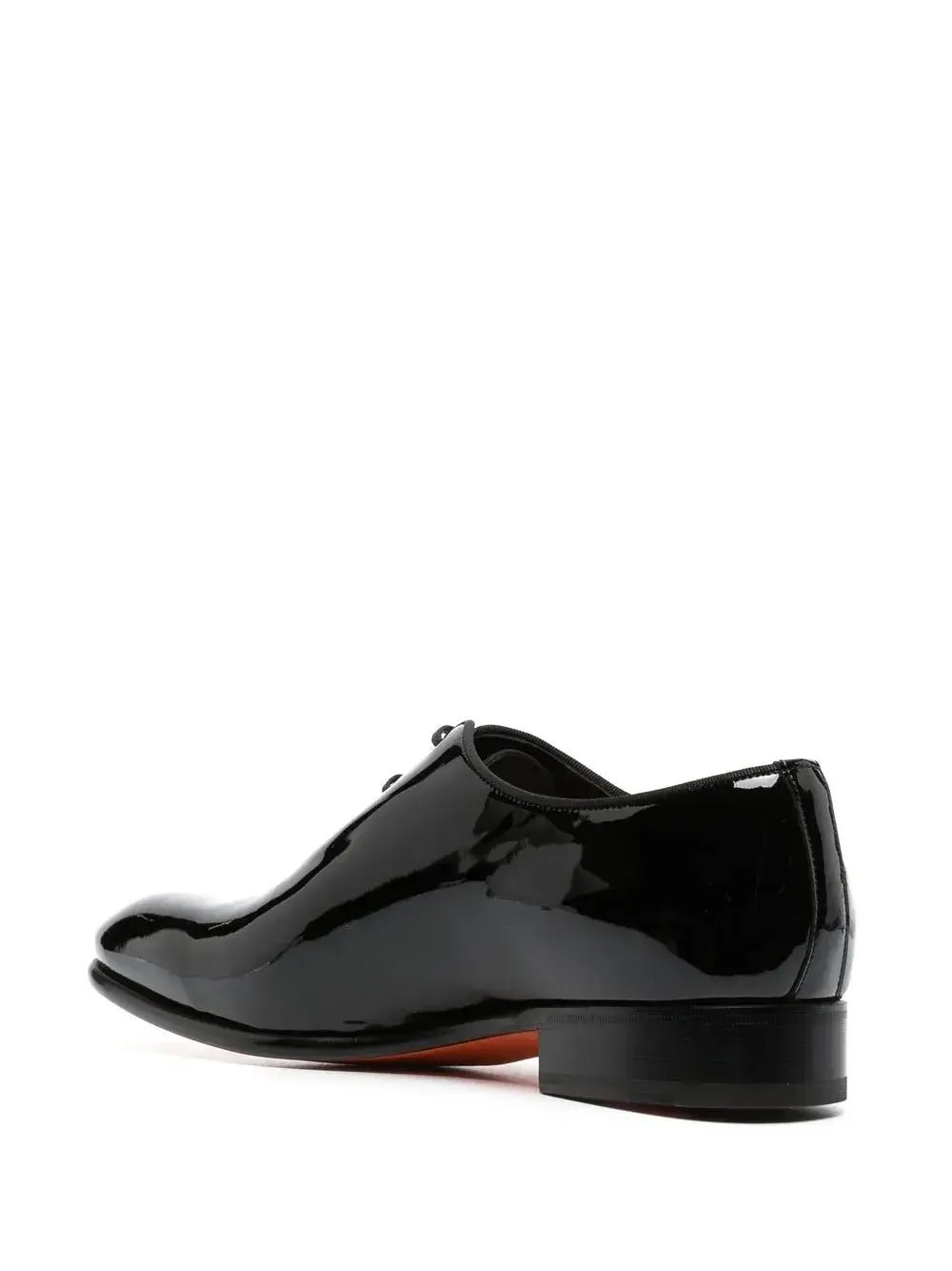 Черный, телячья кожа, лакированная отделка, миндалевидный носок, шнуровка спереди, блочный каблук и стелька с логотипом.