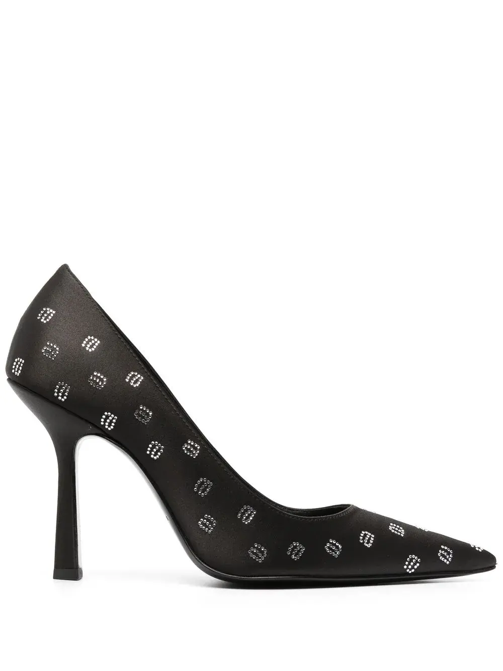 Черный, телячья кожа, узор с изображением монограммы, декор из кристаллов, заостренный носок и каблук-шпилька.