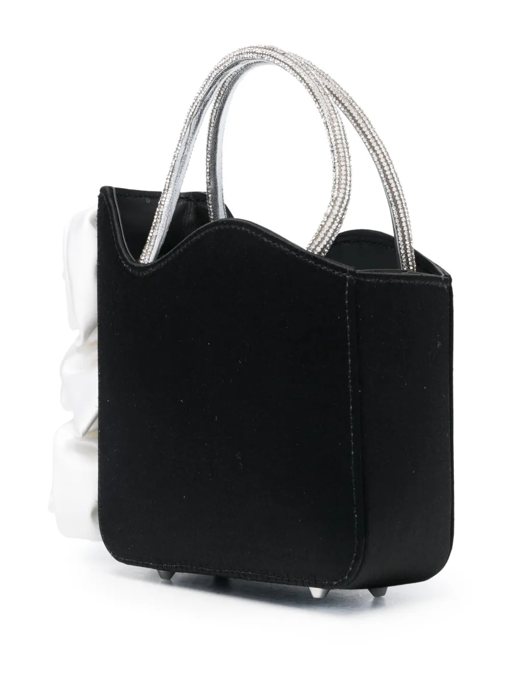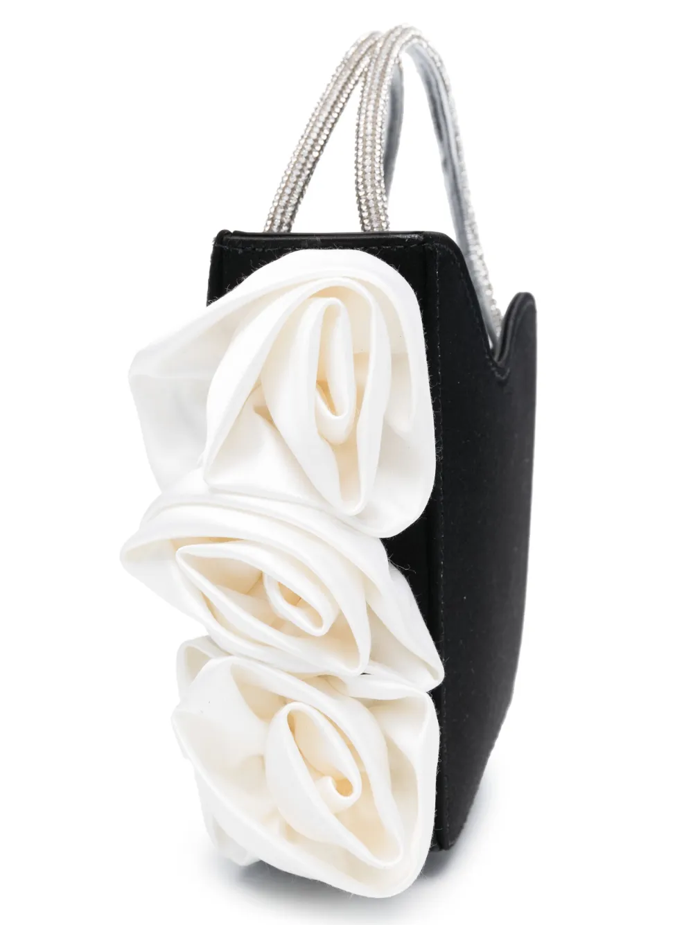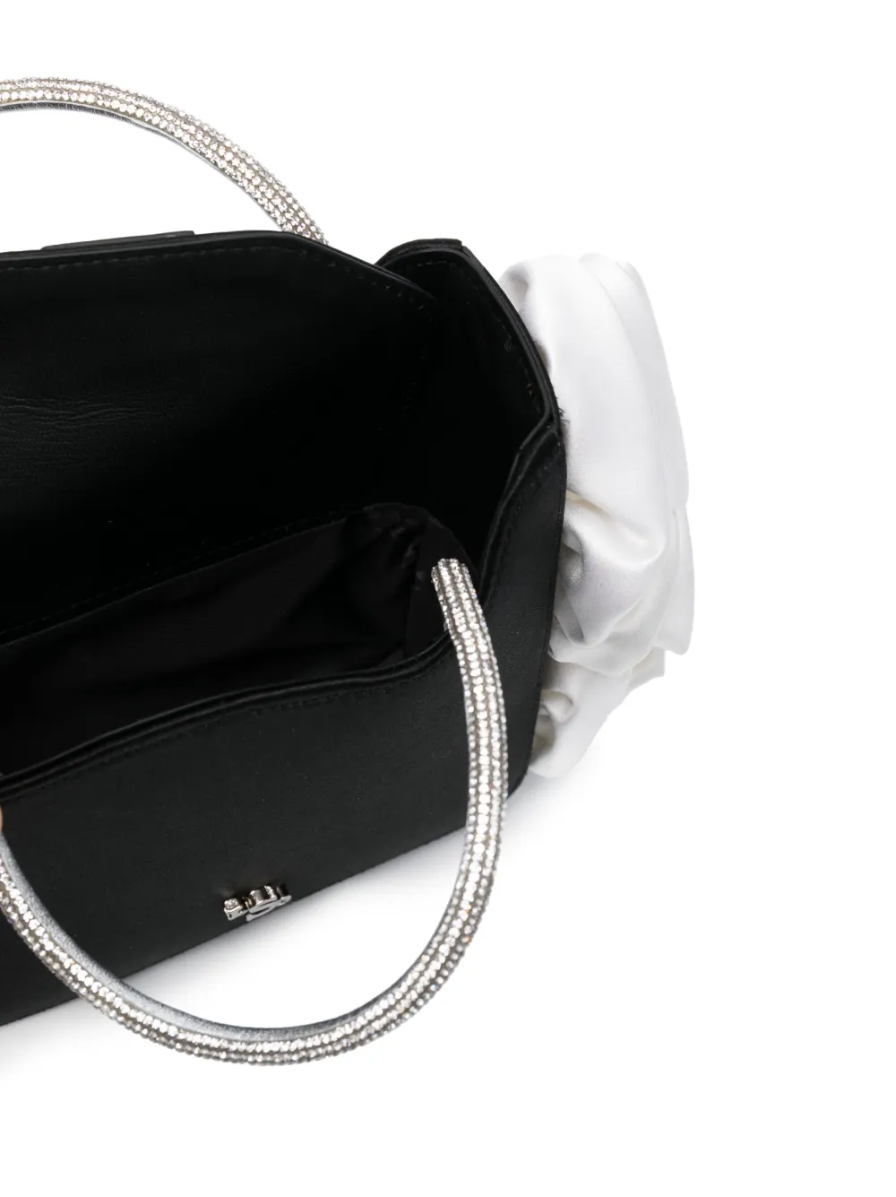 Черный/белый, серебристый, козья кожа, сатиновая фактура, декор в виде искусственного цветка, украшения из горного хрусталя, серебристый металлический логотип, дизайн с открытым верхом, съемный регулируемый ремень на плечо и две закругленные верхние ручки.