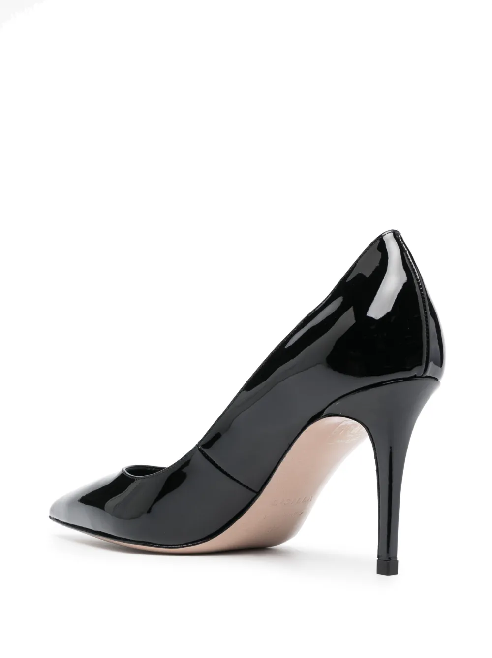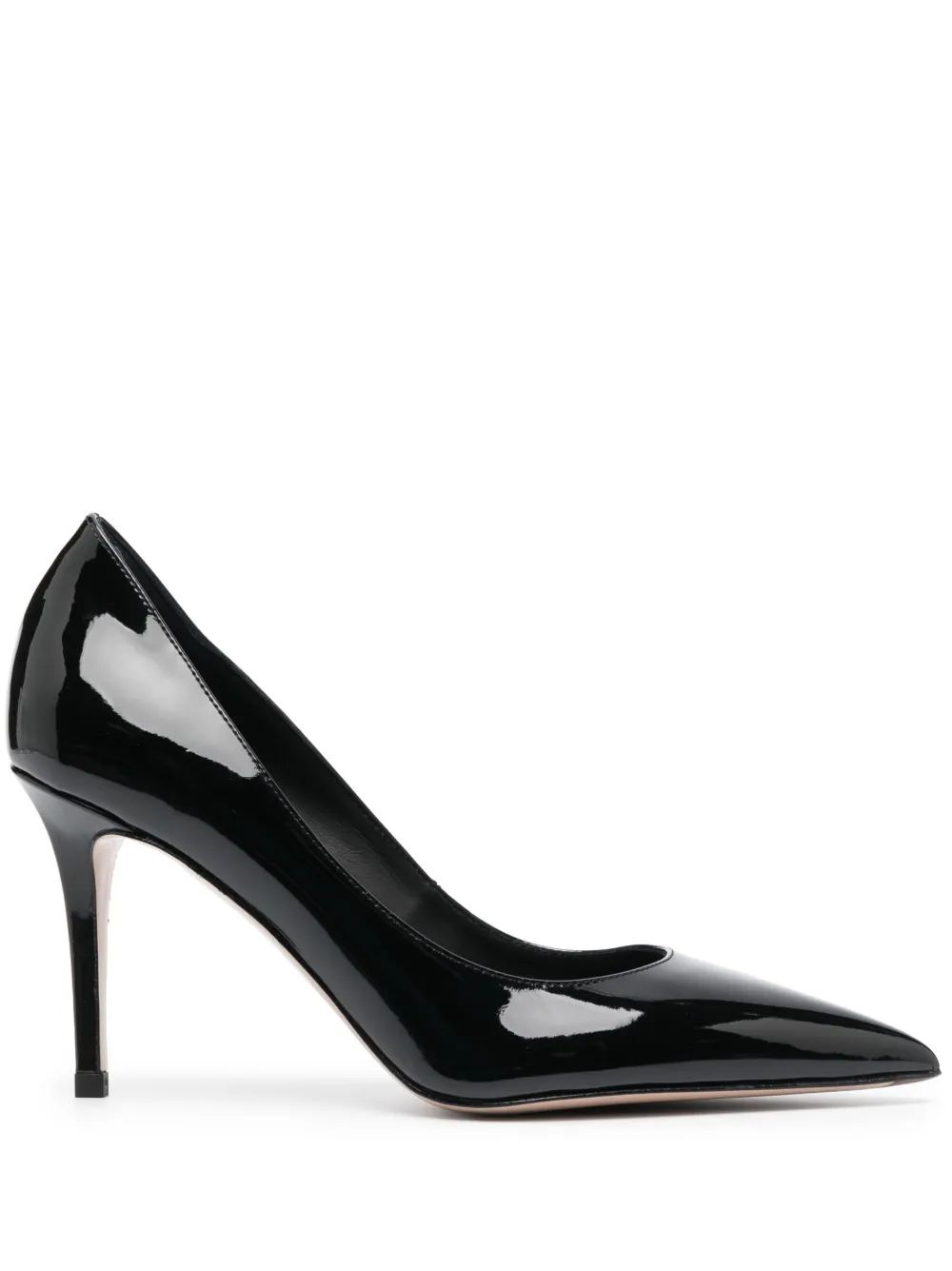 Черный, телячья кожа, лакированная отделка, заостренный носок, модель без застежки, каблук на высокой шпильке и кожаная стелька с логотипом.